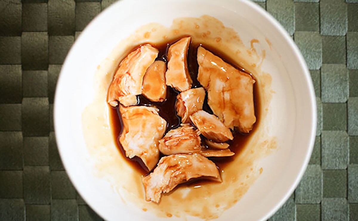 (1)調味料を混ぜ合わせ、食べやすく手でちぎったサラダチキンを5分ほど漬けこんでおく