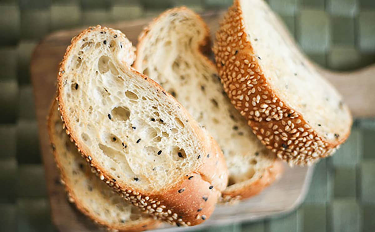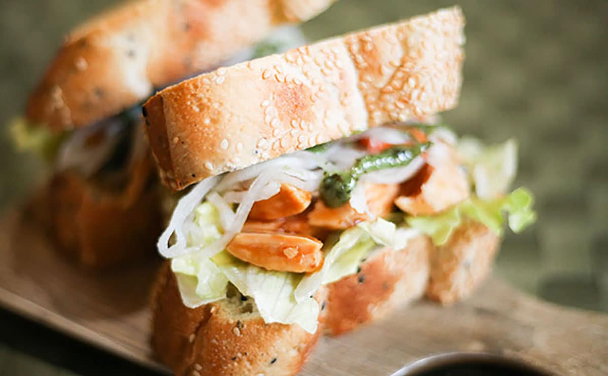 (3)焼いたごまフランスパンにレタスやサラダチキン、なます漬、パクチーをはさみ、完成!