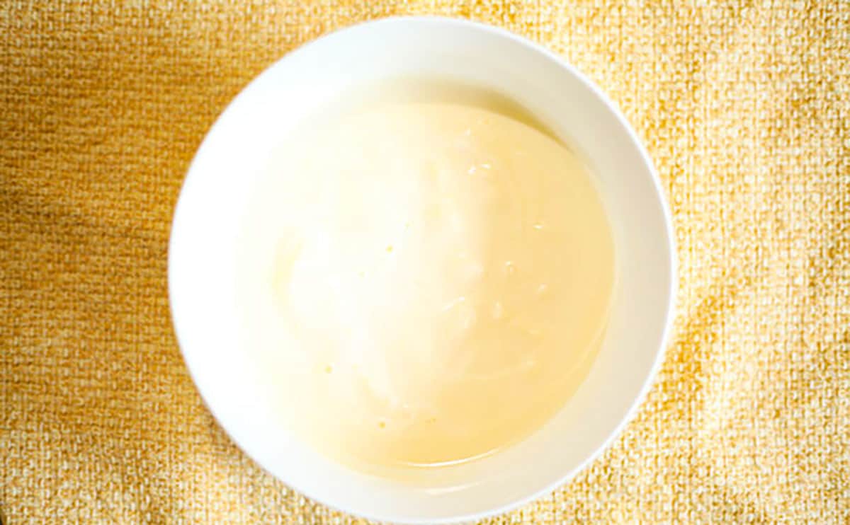 (1)耐熱ボウルにバニラアイスを入れ、電子レンジ(600W)で30秒ほど加熱して溶かす