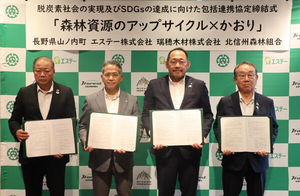 町では、環境保全・地域の魅力発信・産業育成を同時にかなえるプロジェクトとして、官民連携で「かおりプロジェクト」を推進中。2024年10月には、エステー、瑞穂木材、北信州森林組合と包括連携協定を締結している。