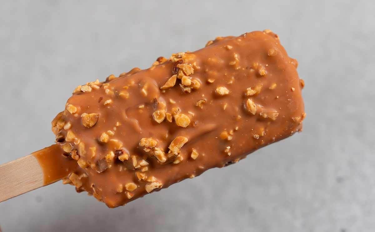 シュガーコートしたマカダミアナッツクランチと、アーモンドクランチを混ぜ込んだキャラメルチョココーティングが特長のキャラメルアイスバー。