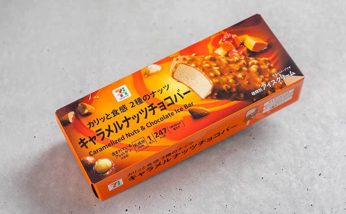 2種類のナッツが贅沢に混ざったチョココーティングは、パリッ・カリッとした食感が楽しく、一口目からキャラメルの濃厚な甘さが広がります。中のアイスも滑らかで、冬らしいコク深い味わいに大満足。1本約279円と少しリッチですが、SNSでも「うますぎ」と話題の逸品です。ナッツ好きなら絶対食べてほしい、高級感あふれる一品でした!