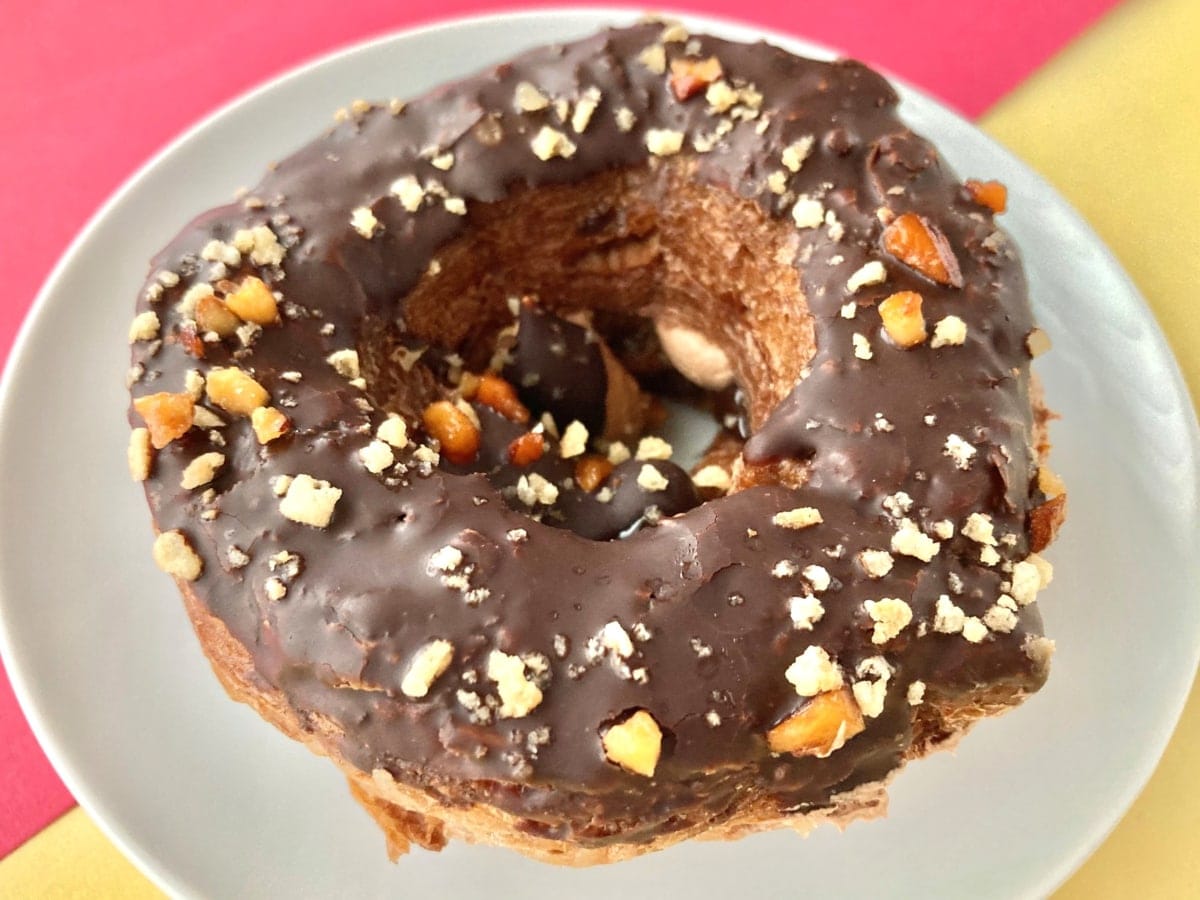 ナッツがたっぷりトッピングされたドーナツで、内側はチョコクリームがはみ出ています。生地はクロワッサンのようなジュワっと感があってくちどけもよく、食べやすくなっています。生地自体はビターな味わいで、甘さは控えめ。全体的に甘さのバランスや、クロワッサン生地・ナッツの食感が計算されており、クオリティの高さを感じました。ネット上では「めちゃくちゃ美味かった」「濃厚なのに軽い食感なのでペロリ」「クリーミーでとろーり濃厚」などの好評の声が多い様子でした。