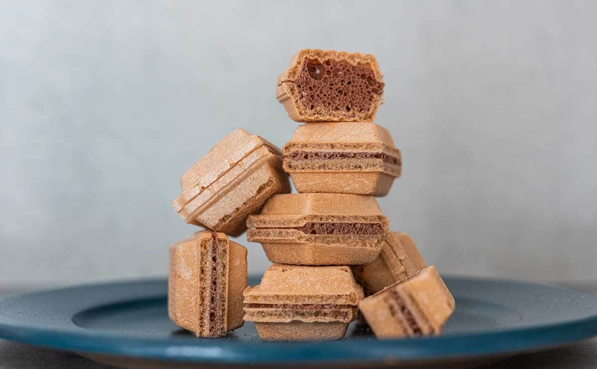 ふわふわ食感のエアインチョコを、サクサクのモナカでサンドした、ひとくちで食べやすいチョコモナカ