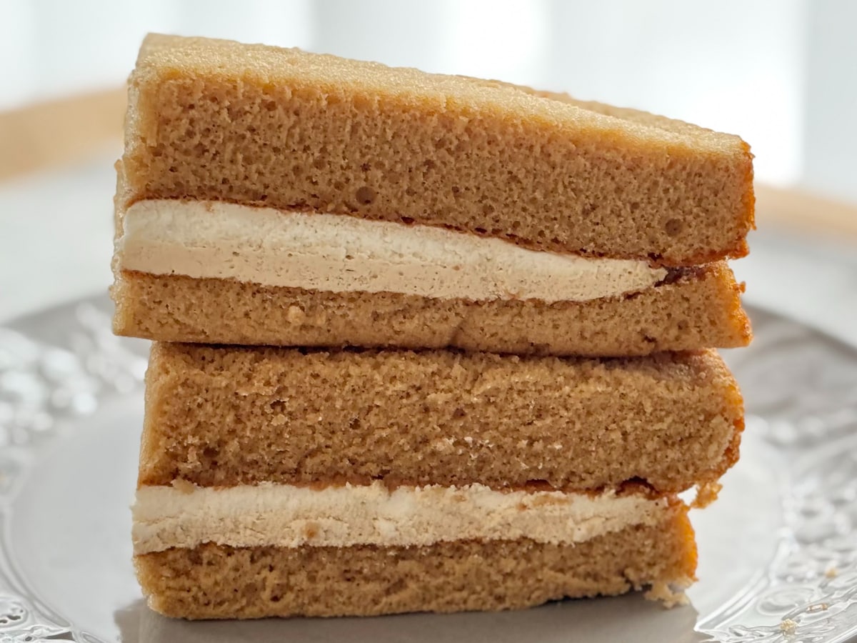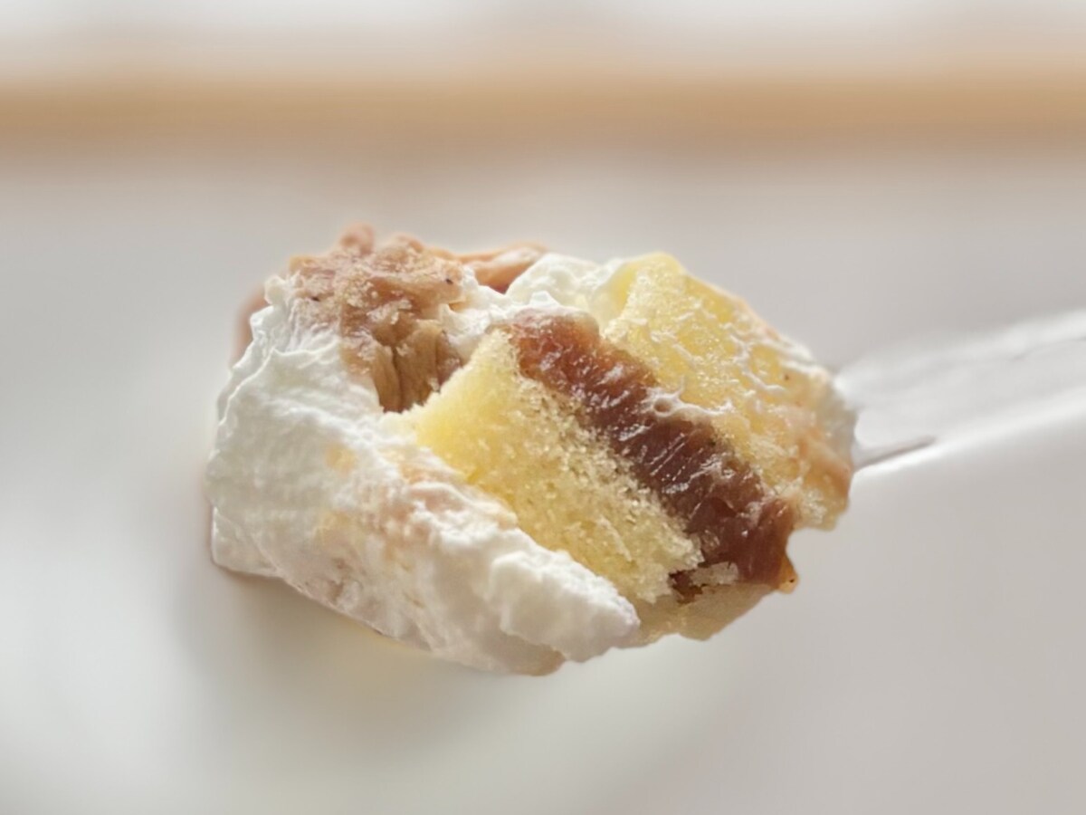 ふわっと軽く、モチモチした食感の大人気シフォンケーキから新フレーバーが登場。上に乗ったキャラメルクリームは甘さだけではなく香ばしさとほろ苦さも感じられて、生地との相性がしっかり取れていて満足感があります。クリームのない部分だけでも十分な風味があって、全体として「とろけるような口当たり」が印象的。SNSでも「美味しすぎて飛んだ」という言葉が出るほどの好評ぶりで、キャラメル好きには特におすすめの一品です。