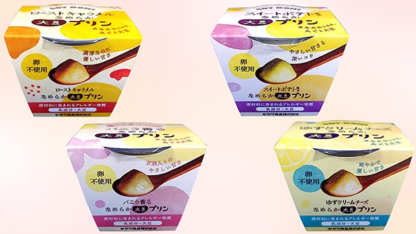 「大豆プリン」シリーズは、卵を使わずに、大豆をまるごと活かした、なめらかな食感とコク深い味わいが特徴で、ローストキャラメル・ゆずクリームチーズ・バニラ・スイートポテト風味の4種類をラインナップ。健康と美味しさを両立させた新しい大豆スイーツとなっている。