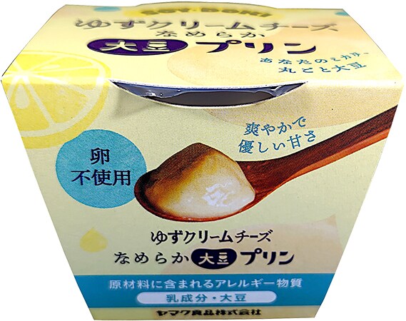 「大豆プリンゆずクリームチーズ」の原材料は、砂糖(国内製造)、大豆(分別生産流通管理済み)、乳加工品、ゆずジャム、澱粉加工品(澱粉、粉あめ、寒天)/増粘剤(加工デンプン)。
