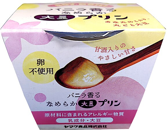 「バニラ香る大豆プリン」の原材料は、砂糖(国内製造)、大豆(分別生産流通管理済み)、乳等を主要原料とする食品、澱粉加工品(澱粉、粉あめ、寒天)、甘酒(米麹、米)、バニラビーンズ/増粘剤(加工デンプン)、香料。