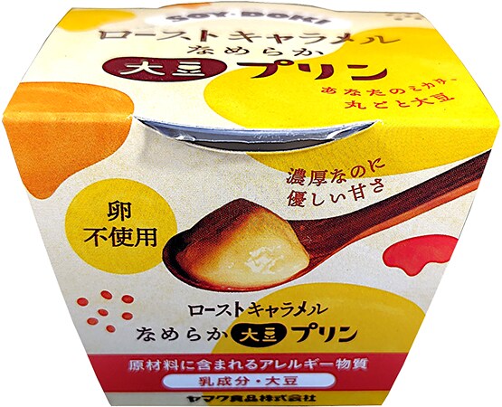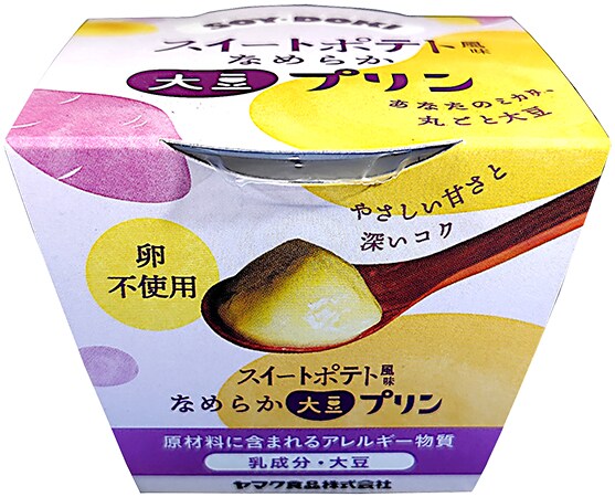 「スイートポテト風大豆プリン」の原材料は、砂糖(国内製造)、大豆(分別生産流通管理済み)、乳等を主成分とする食品、澱粉加工品(澱粉、粉あめ、寒天)/増粘剤(加工デンプン)、香料、クチナシ色素。