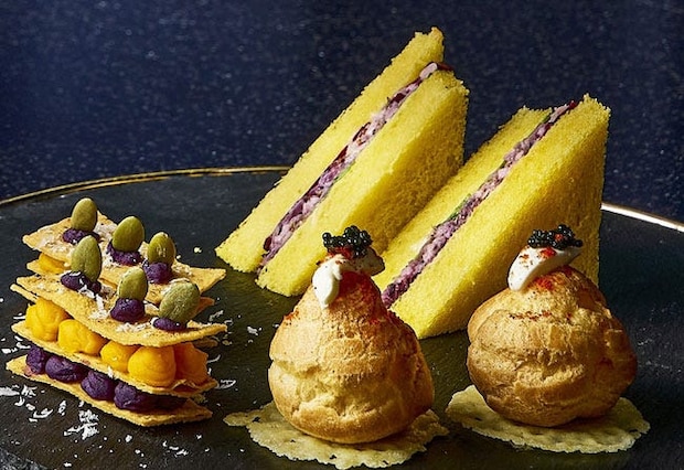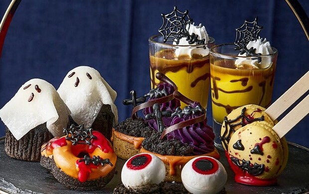 セイボリーは、軽やかなサーモンムースを詰めたひと口サイズの「サーモンムースのシュー」や、彩り豊かな具材を挟んだ遊び心あふれる「ハロウィンサンド」などが用意される。