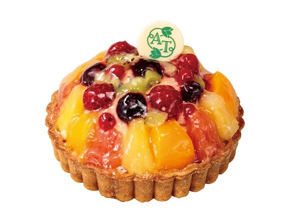 アフタヌーンティー・ティールームのいろとりどりのフルーツを使った華やかなタルトケーキ。アーモンド生地のタルトに2種のクリームとスポンジを重ね、7種のフルーツを飾り付けた。