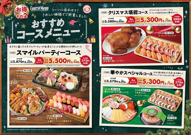 シェアできるクリスマスオードブル・寿司20貫・ローストビーフ&サーモンサラダセットの3つをセットにした。