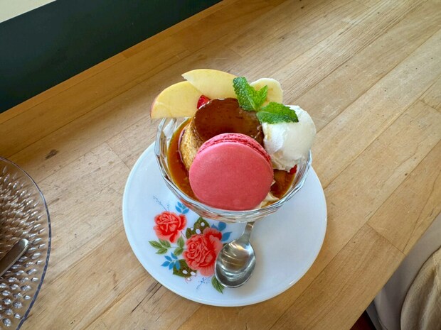 どこか懐かしくて、丁寧に作られた味がじんわり広がる。プリンのほろ苦さとフルーツの甘酸っぱさのバランスが絶妙!