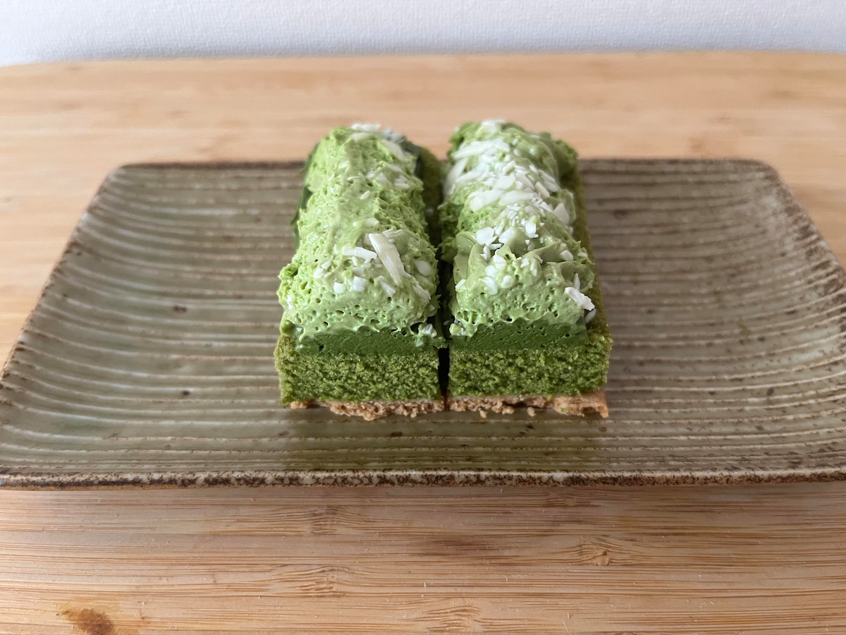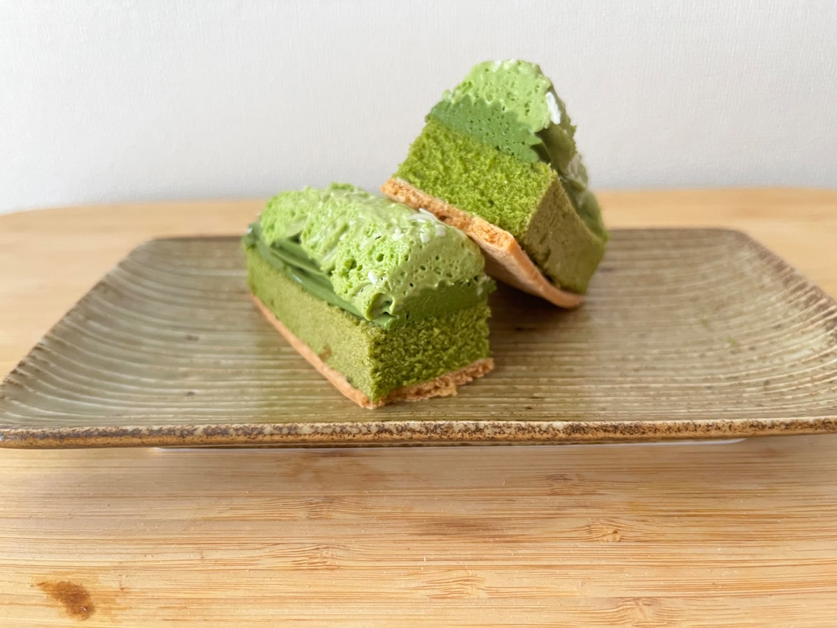 一番上から抹茶ホイップクリーム、抹茶ガナッシュ、抹茶スポンジ、クッキーで構成されています。一口食べてみると、ふんわりとした生地の中に練り込まれた濃厚な抹茶の風味が広がります。抹茶のほろ苦さと甘みが絶妙に調和しており、パクパク食べることができました。