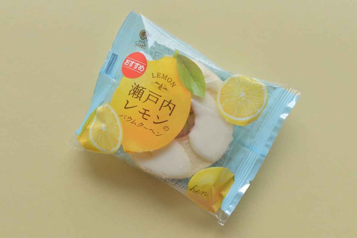 レモンのイエローに爽やかなブルーのパッケージがかわいい、『瀬戸内レモンのバウムクーヘン』(税込168円)。赤い「おすすめ」のシールが貼られています。