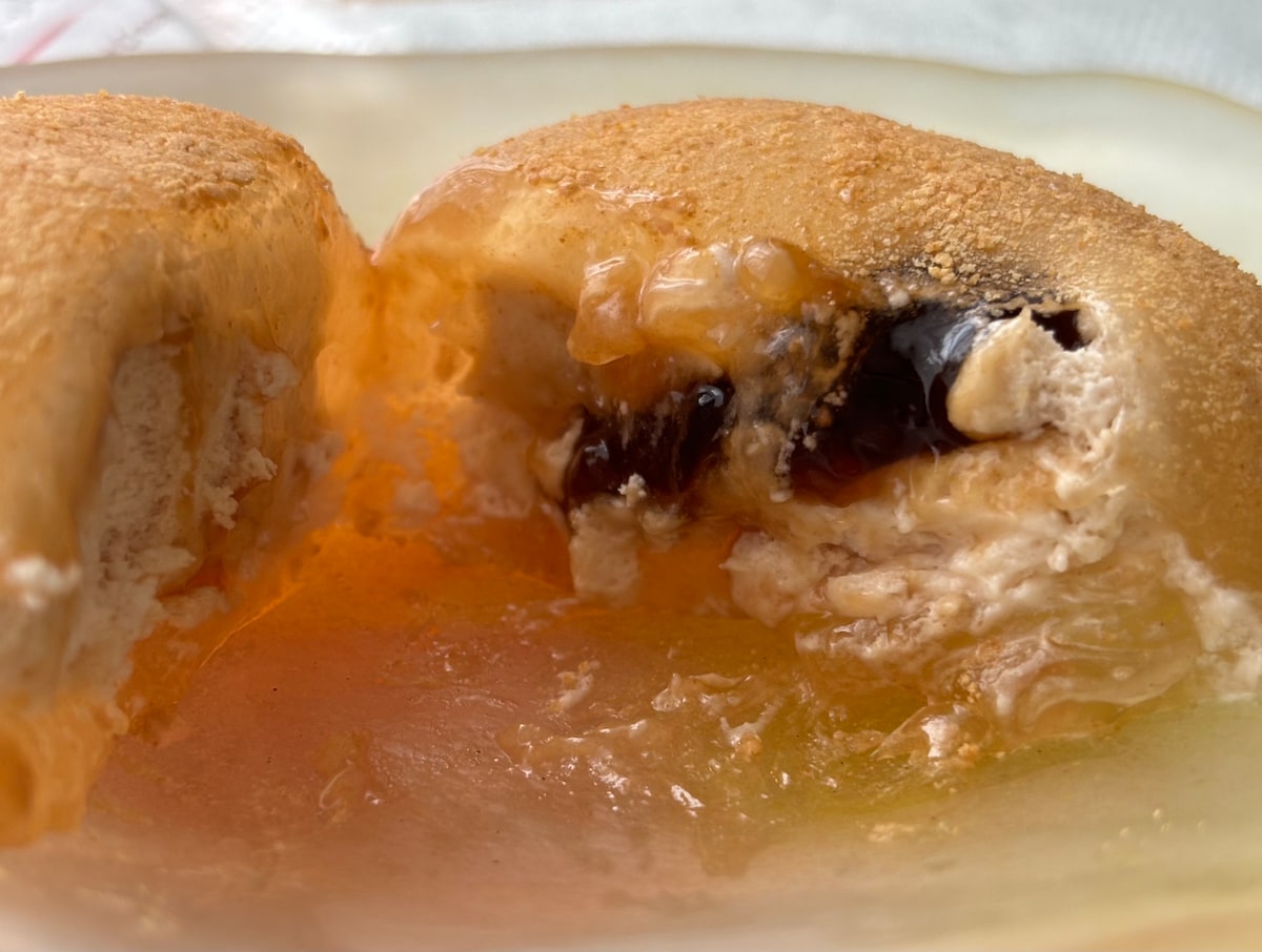慎重にカットしてみると、中にはきなこホイップと黒蜜がたっぷり。もう見るからにおいしそうです!