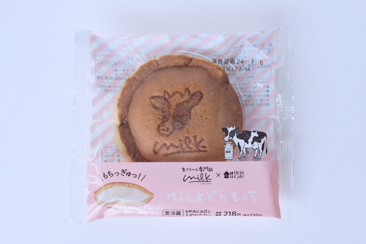 かわいいピンクが目を引くパッケージ。クリアフィルムで、どらもっちにMilkのキュートな牛の焼印が押された商品が見えています。そんな「Uchi Café×Milk MILKどらもっち」はローソン標準価格235円(税込)。パッケージを目印にスイーツコーナーを探してみてください。