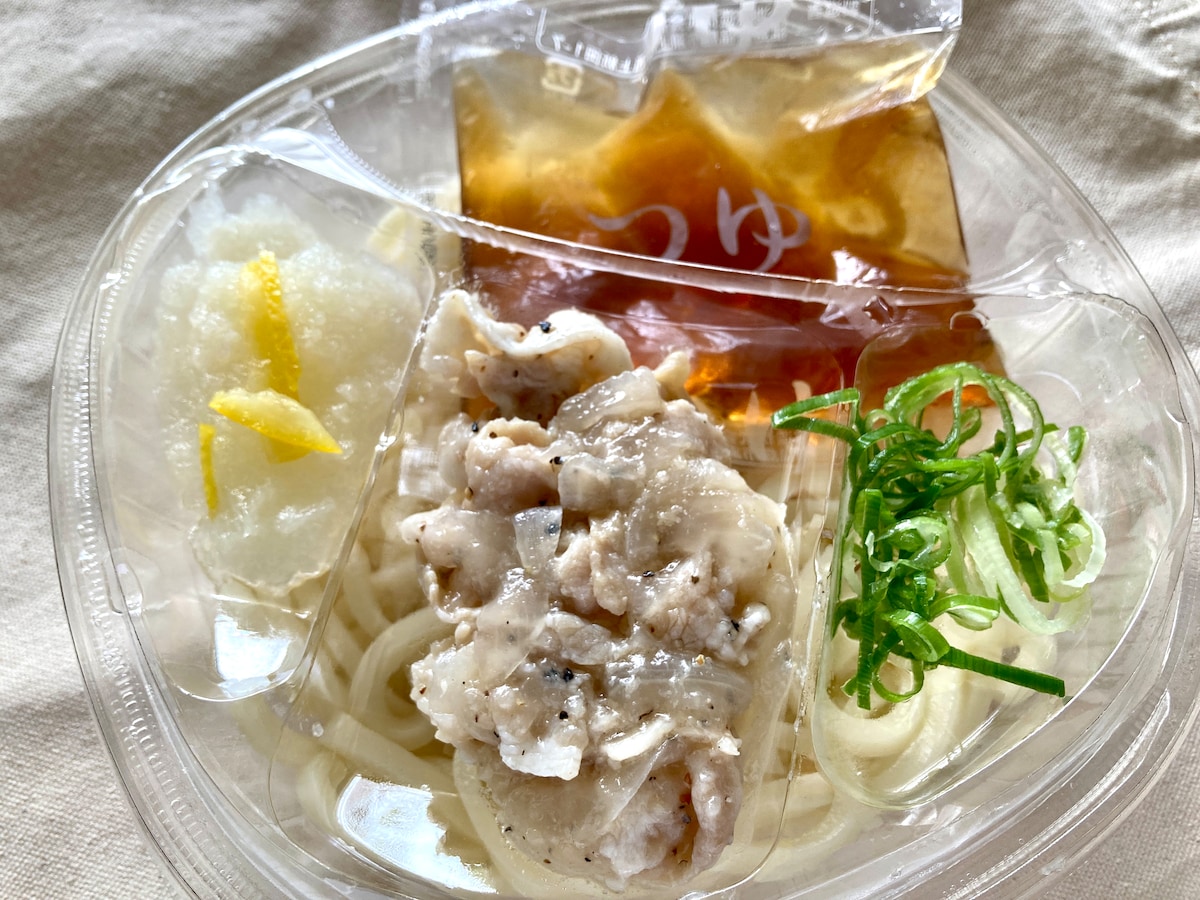 具材は左上から大根おろしとゆず、豚肉、小ねぎ。大根おろしは汁気が多めなので、コンビニから持ち帰るときは真っ直ぐ水平に持つのがベター。(筆者はうっかり斜めになっていたようで、ふたを開けるときにやや手が濡れてしまいました汗)