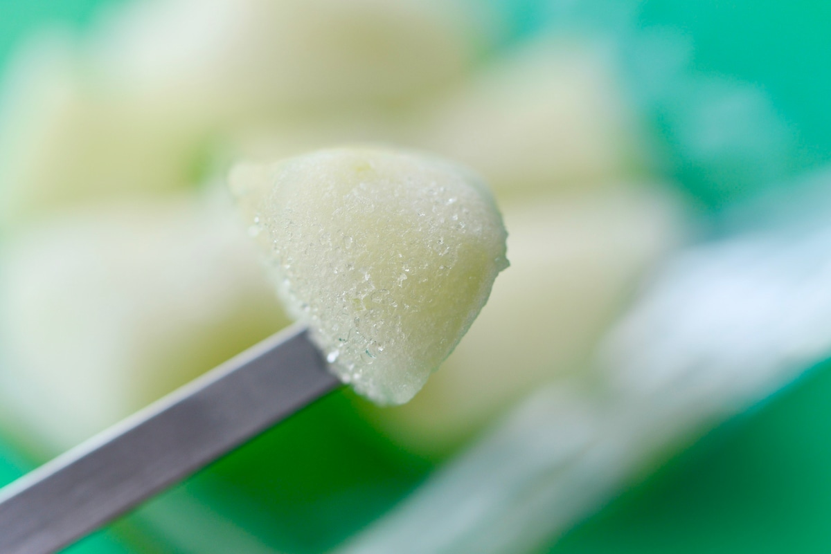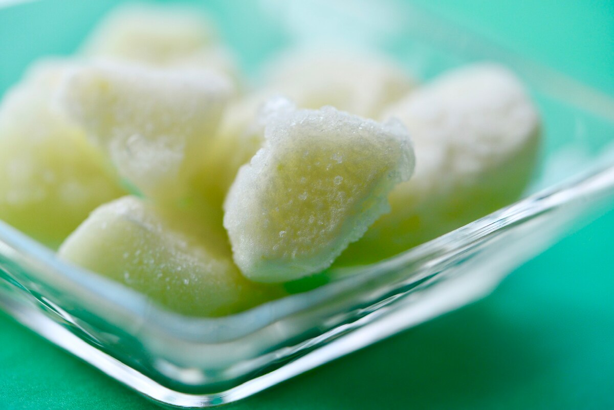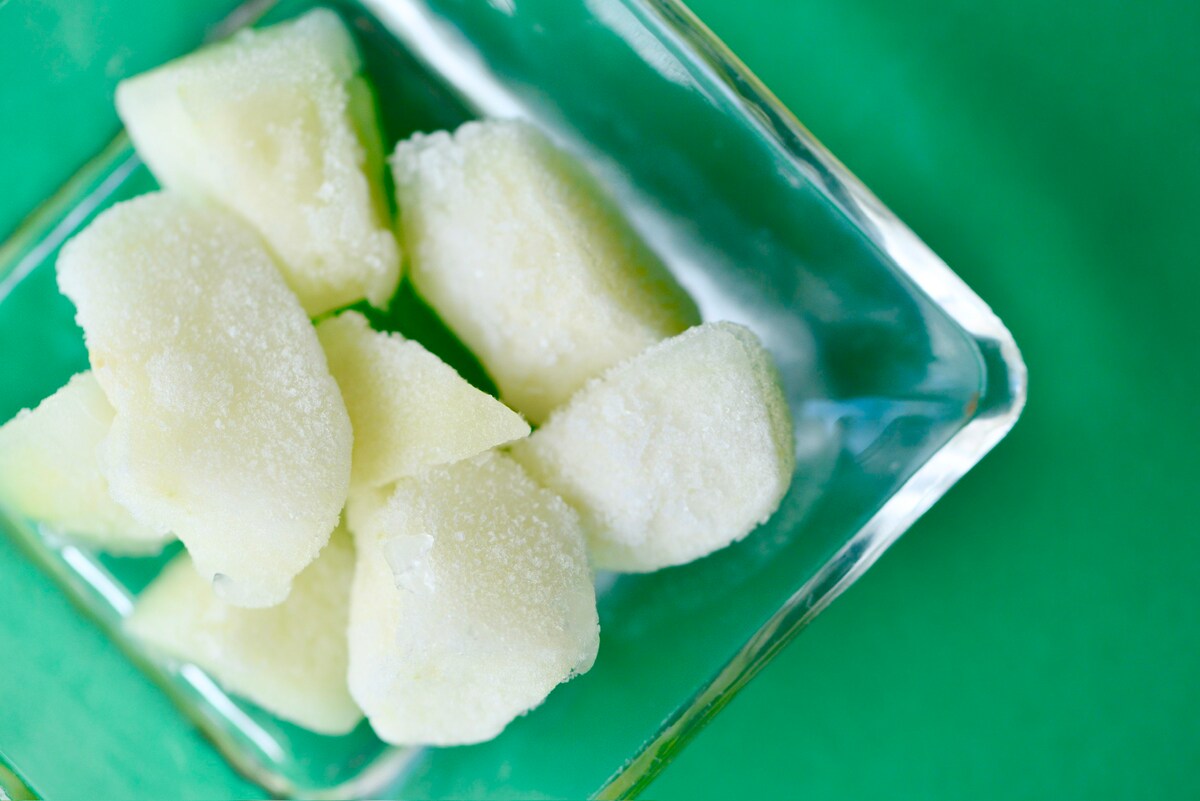 「くちどけりんご 50g」は、アオハタ独自の技術の「やわらかフローズン製法」を用いて作られています。凍っているのにしっとりやさしい食感が特徴です。