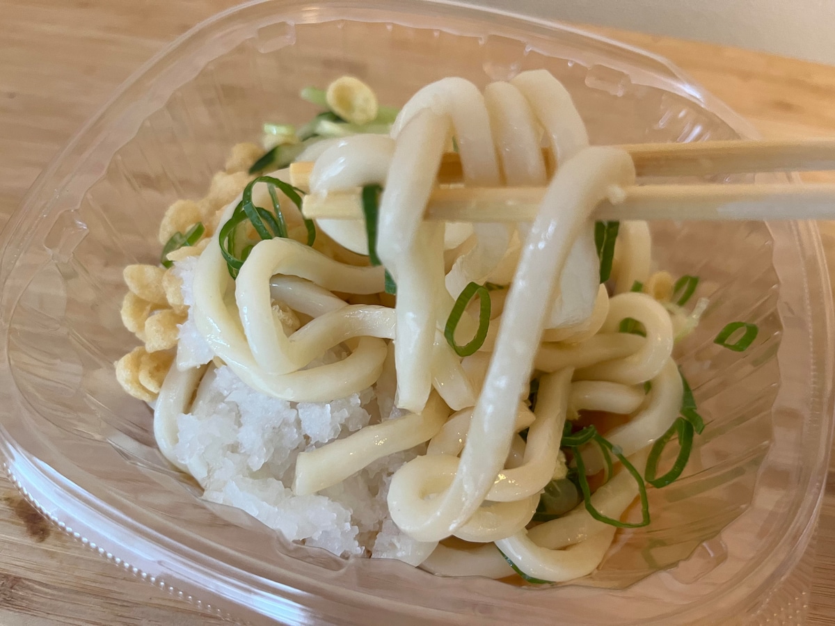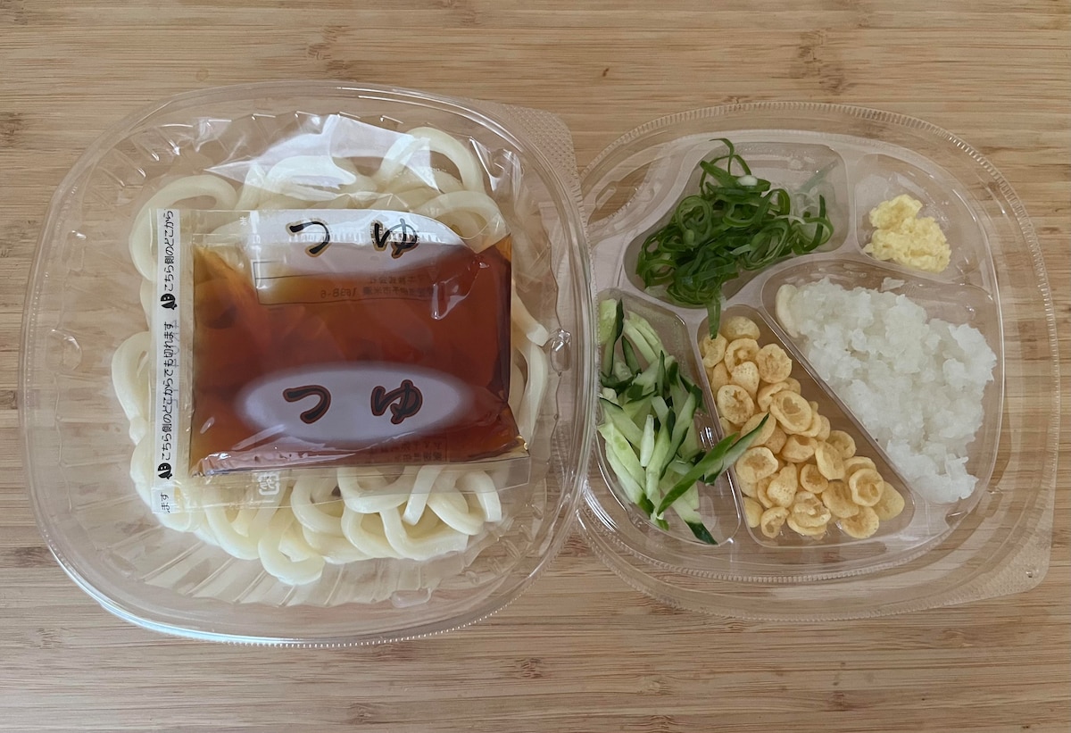 実際に食べてみます。うどんにはコシがあり、大根おろしやきゅうり、おろししょうがでさっぱりと食べられます。これなら食欲がないときにもおすすめ!