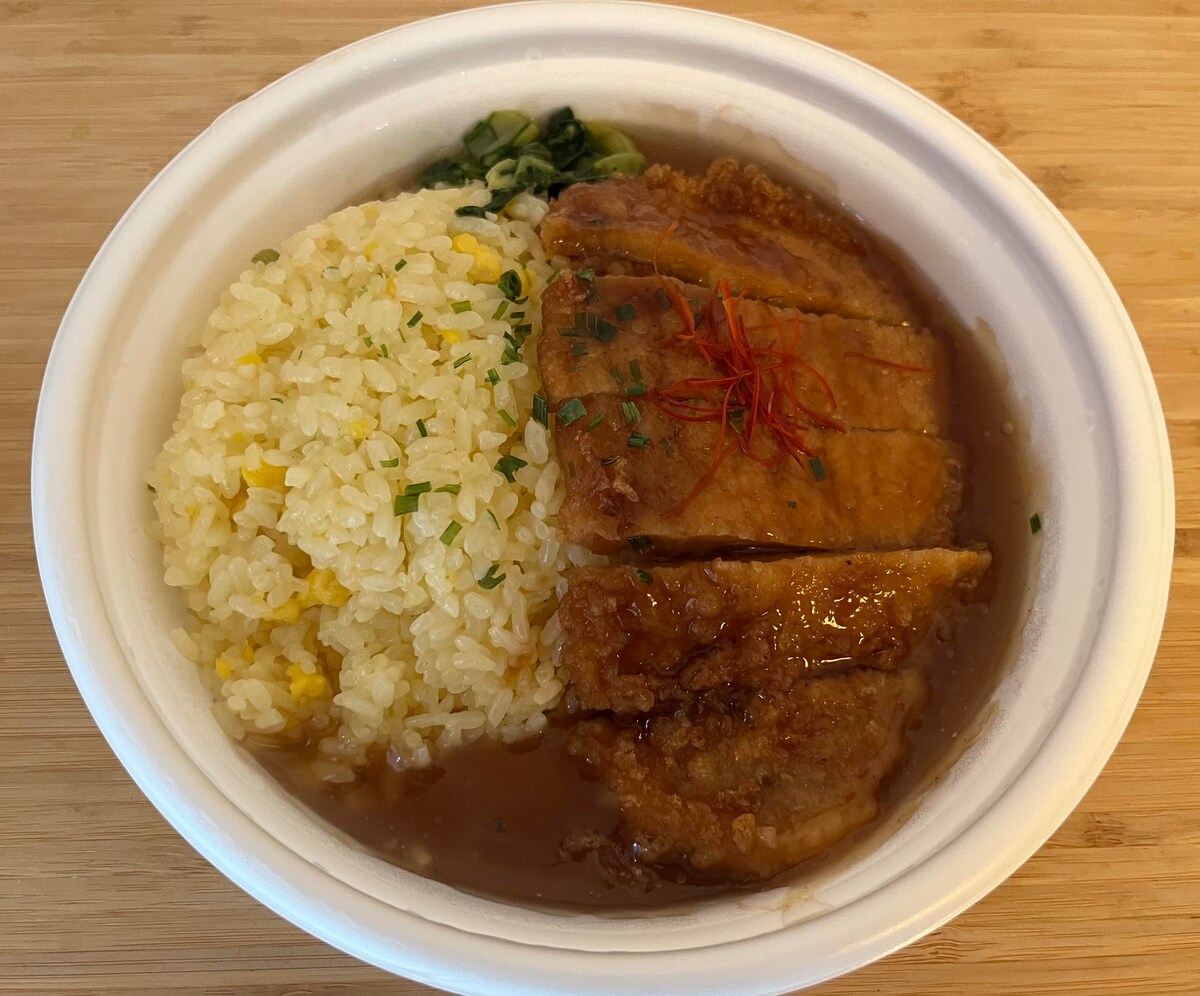 この商品は、豚肉のから揚げにチャーハンを合わせたお弁当になっています。から揚げの上には五香粉を使用した餡がかかっています。