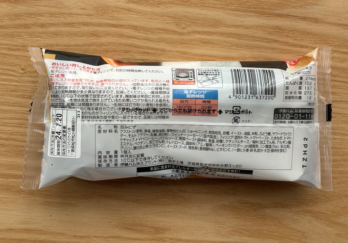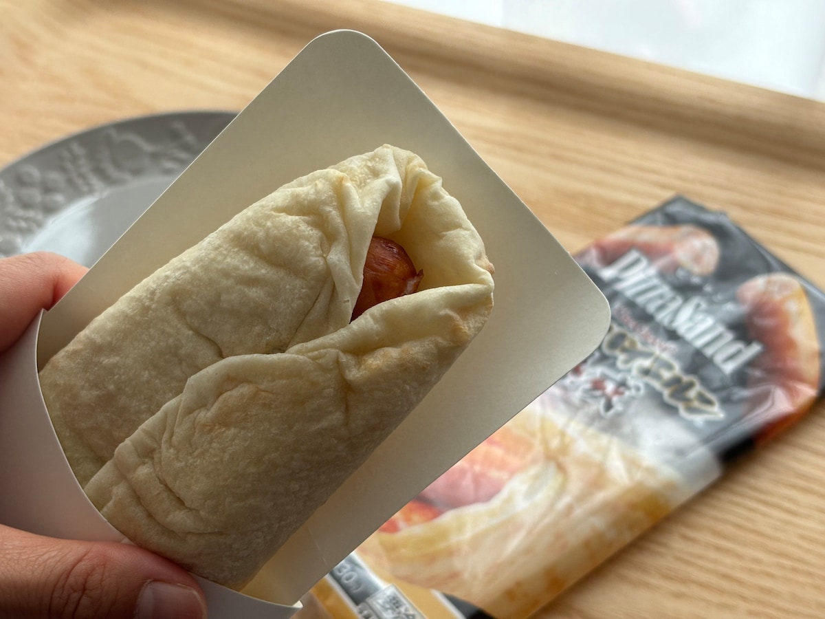 できあがったので、袋の中から取り出してみました。ワンハンドで食べたいときにも便利な紙ケース付き。ピザ生地からはソーセージがチラリと顔をのぞかせています。