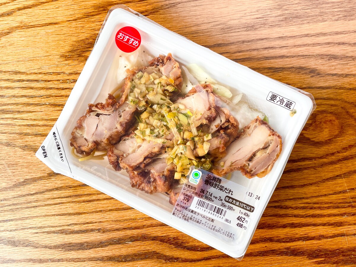 パッケージのフタはクリアになっており、おいしそうな油淋鶏がみえています。赤い「おすすめ」の文字もポイントですね(2024年7月12日現在)。「油淋鶏 香味野菜だれ」はチルド総菜コーナーに並べられています。
