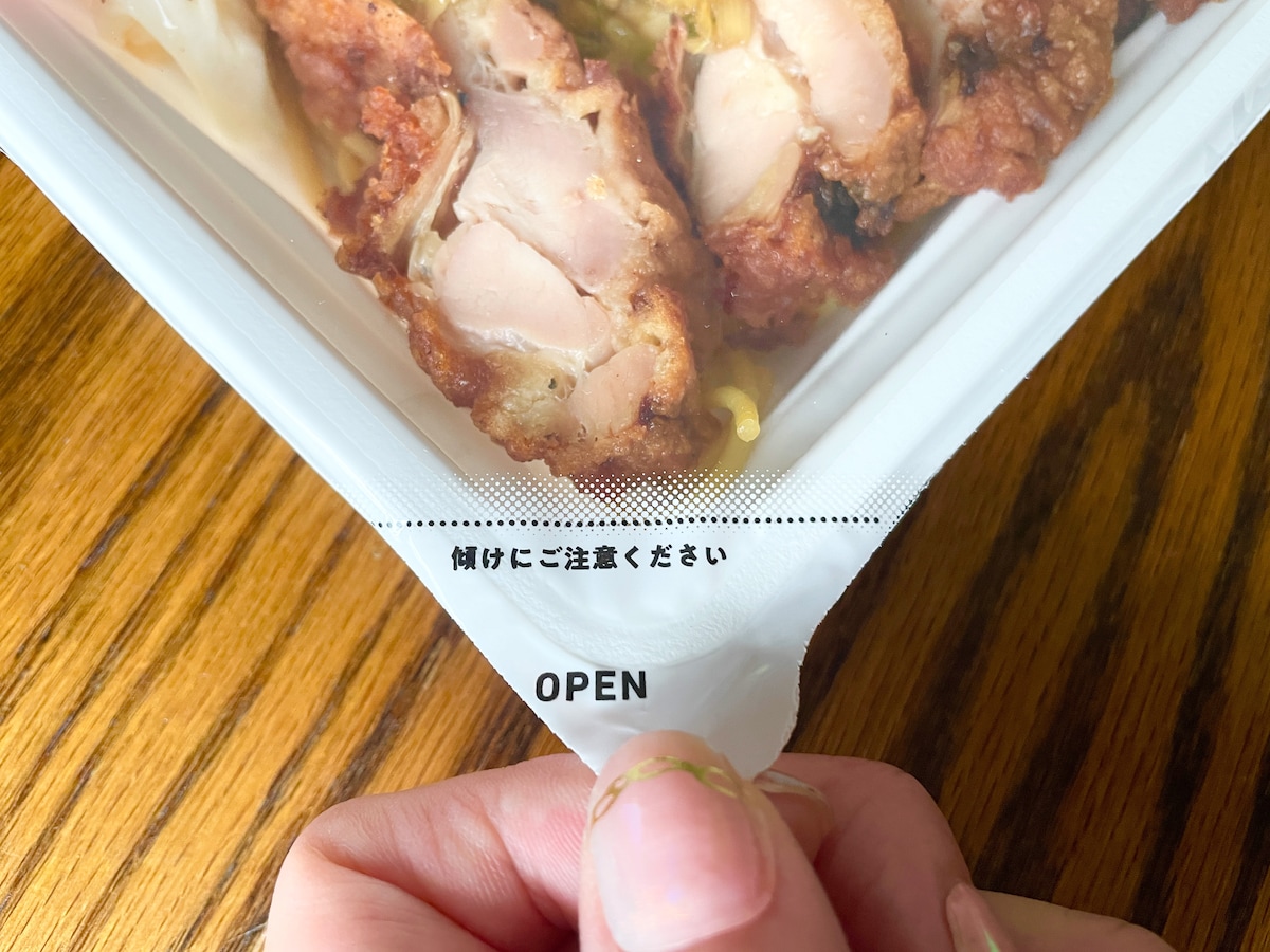 まずは「油淋鶏 香味野菜だれ」のあたため方から。電子レンジであたためる際は商品の左下のフィルム(フタ)を点線部分まで開けましょう。