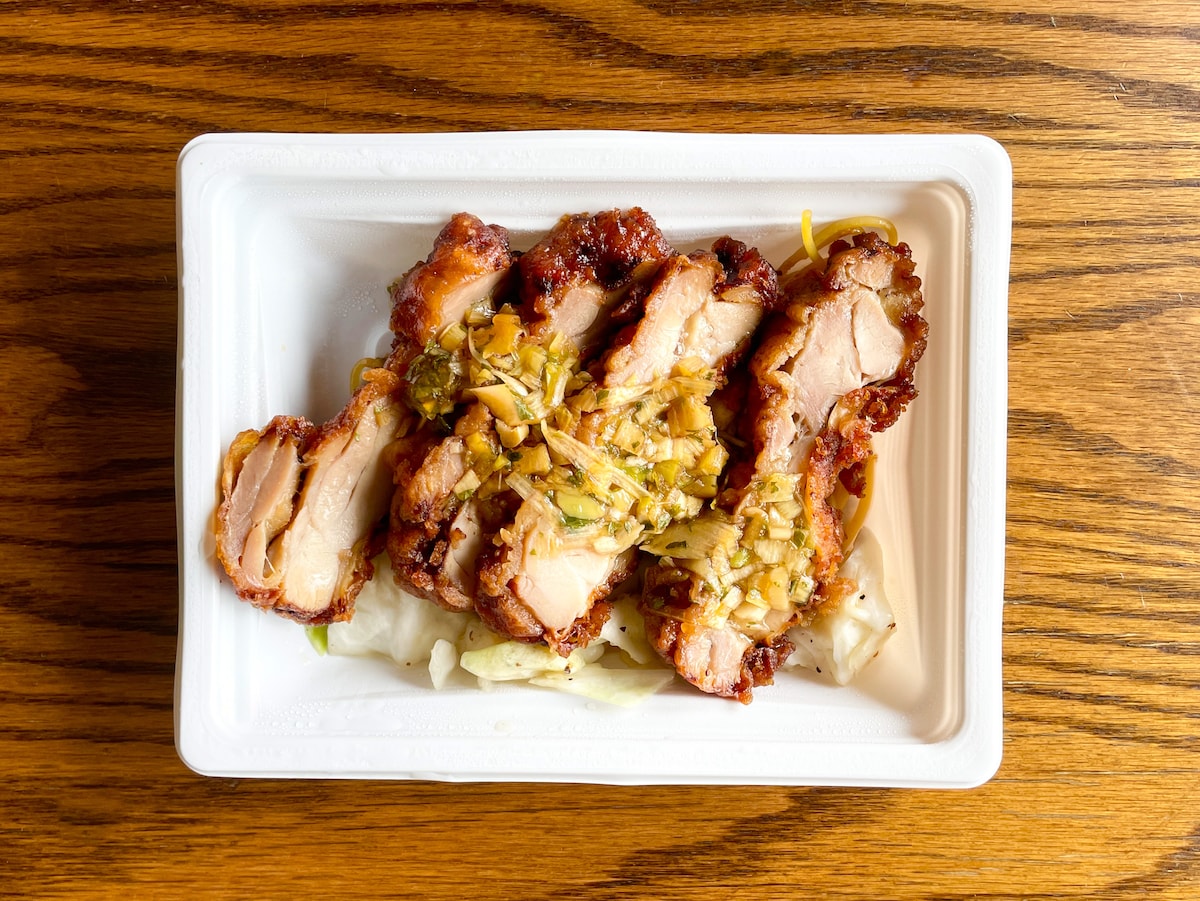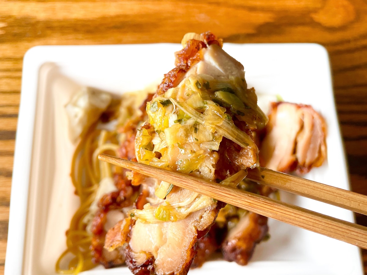 ひとくち食べてみると、皮の香ばしさがふわっと香り、ジューシーなもも肉とネギ、香味野菜だれが混ざり合って、口のなかいっぱいに広がります。しあわせの油淋鶏。キャベツは塩だれ味でブラックペッパーがピリッときいたチョイ辛です。そしてパスタは醤油味。どちらも油淋鶏に合う味付けで、一緒に食べることで、辛さがたったり、マイルドに感じたりと、味の印象の変化も楽しめました。お酒との相性もとってもよさそう!