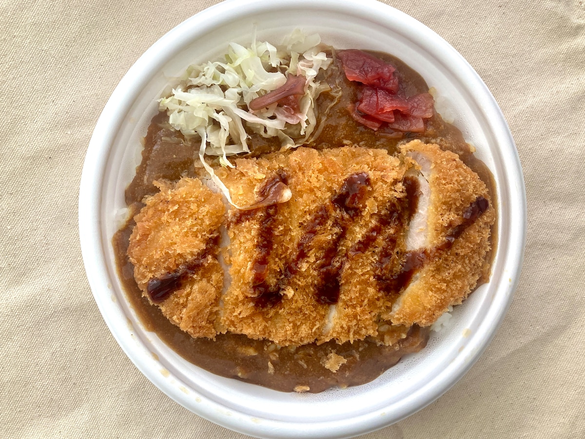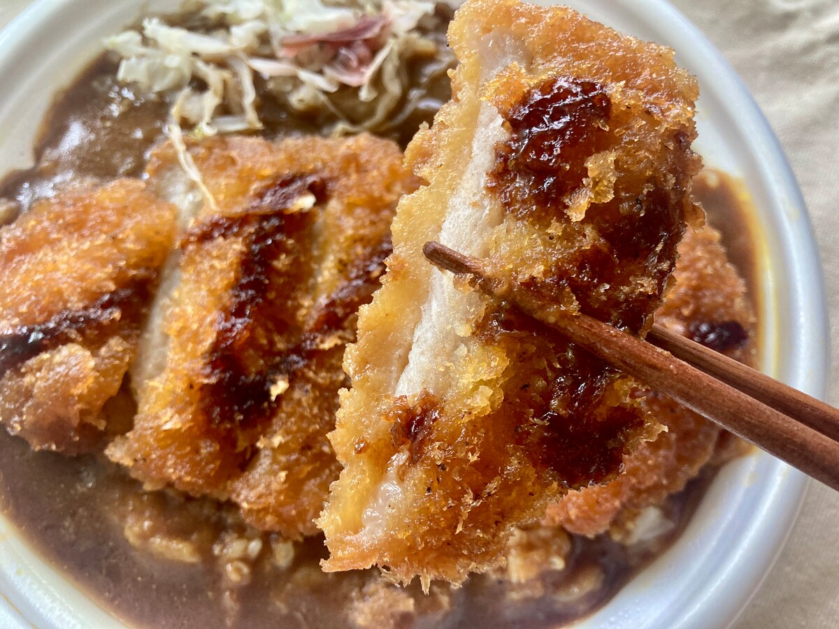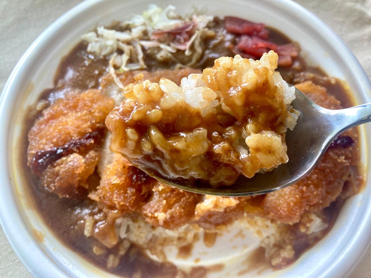 カツの上にはソースがかかっており、これ単体でもおいしそう。ふたを開けた瞬間、美味しそうなカレーの香りがふわりと漂い、食欲が刺激されます。