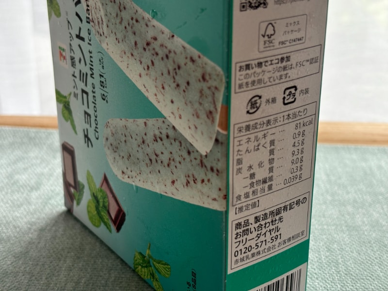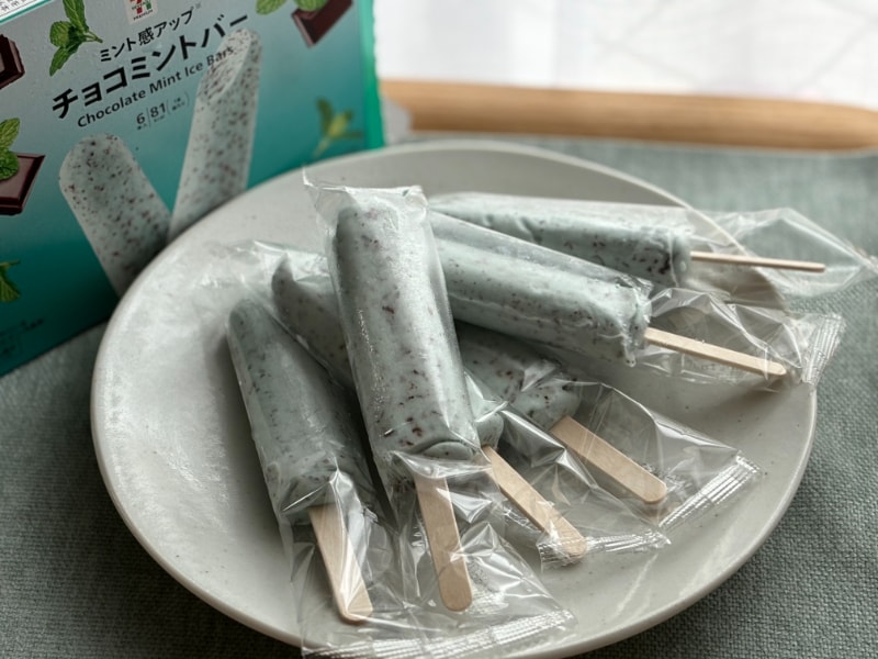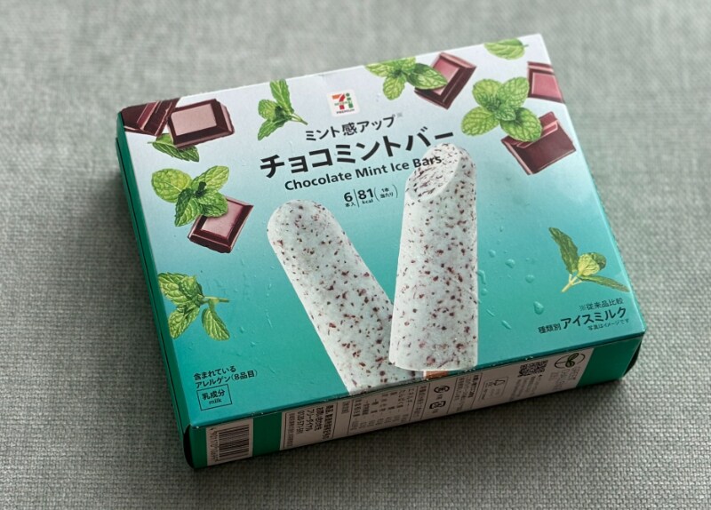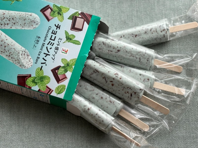 セブン-イレブンで販売されている「チョコミントバー 6本入」(税込300円)。ミント強めのアイスバーが6本入った箱アイスです。
