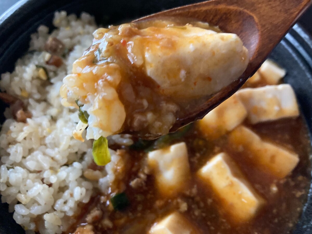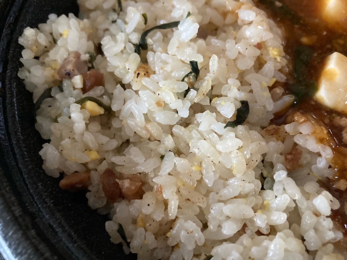 また、細かい豚肉が麻婆餡とチャーハンの両方に入っており、食べているときに肉感があったのも印象的。あっという間に食べてしまいました。