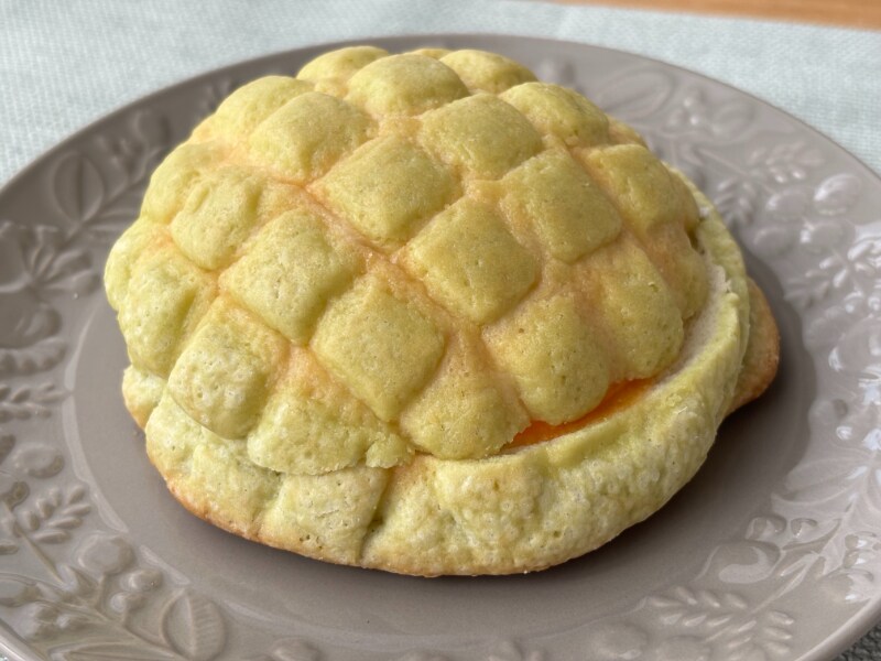 普通のメロンパンよりも、やや緑がかった色合いも特徴的。表面に格子模様がついたメロンパンならではの見た目だけでなく、そのカラーにもメロンっぽさを感じさせてくれます。
