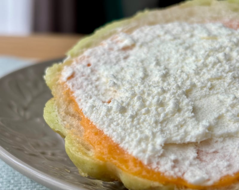 もう一度、元に戻して今度は半分にカット!断面も、メロンソースのオレンジ色が映えてきれいです。