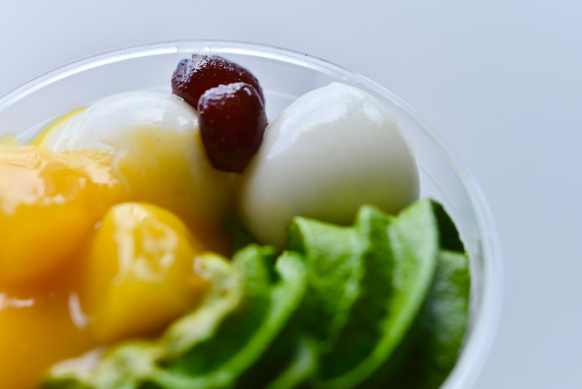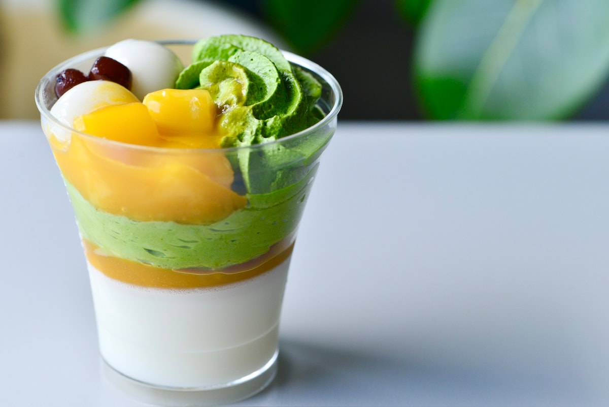 下から、ミルクプリン、マンゴーソース、抹茶ムースの3層になっており、その上に抹茶餡ホイップ、マンゴー、白玉、かのこ大納言が盛り付けられています。