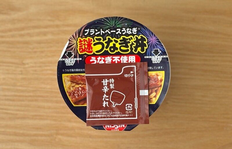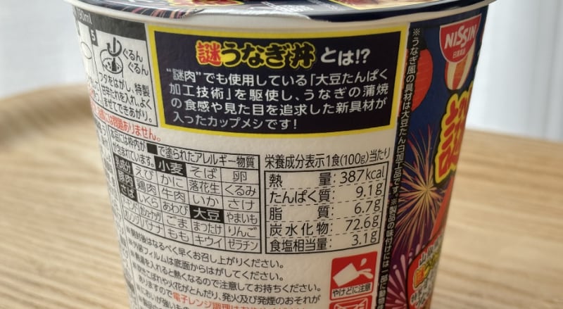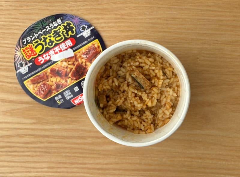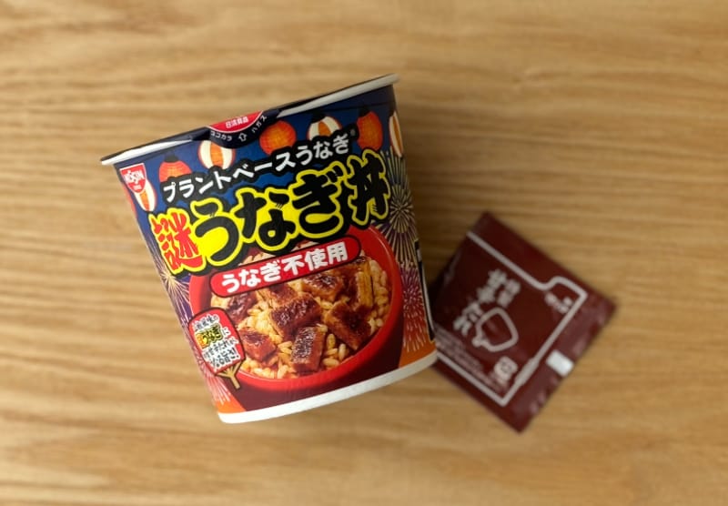 大きく「うなぎ不使用」と書かれた「謎うなぎ丼」。カップの説明によると、『大豆たんぱく加工技術』を駆使し、うなぎの蒲焼の食感や見た目を追求した新具材が入ったカップメシ」なんだそう。