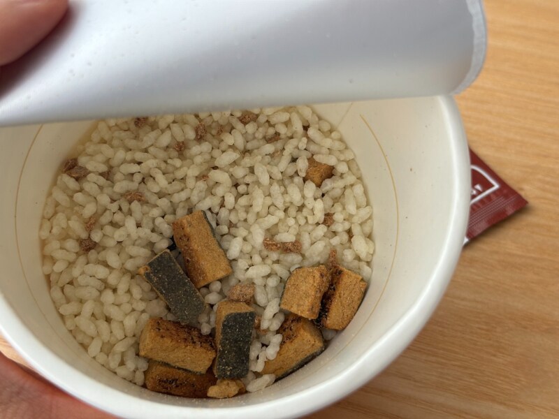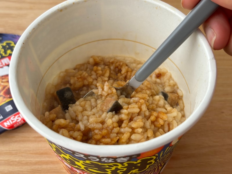 ドキドキしながらふたを開けると、お米と“謎うなぎ”が登場!カップを何度か横にふりふりしてからお湯を注いで調理していきます。