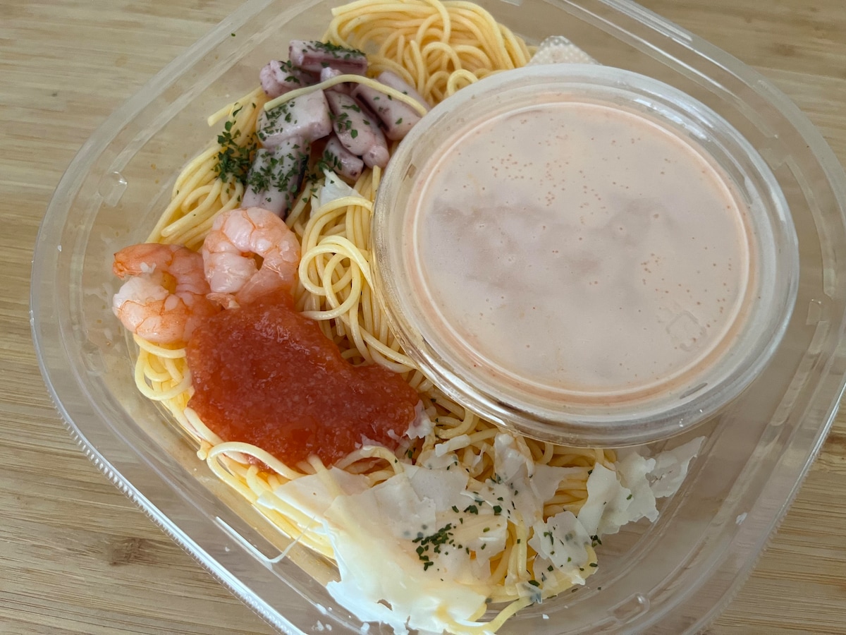開封してみました。細麺のパスタが敷き詰められており、イカやエビ、明太子、プロセスチーズがトッピングされています。また、プラスチックの容器には明太子クリームソースがたっぷり!