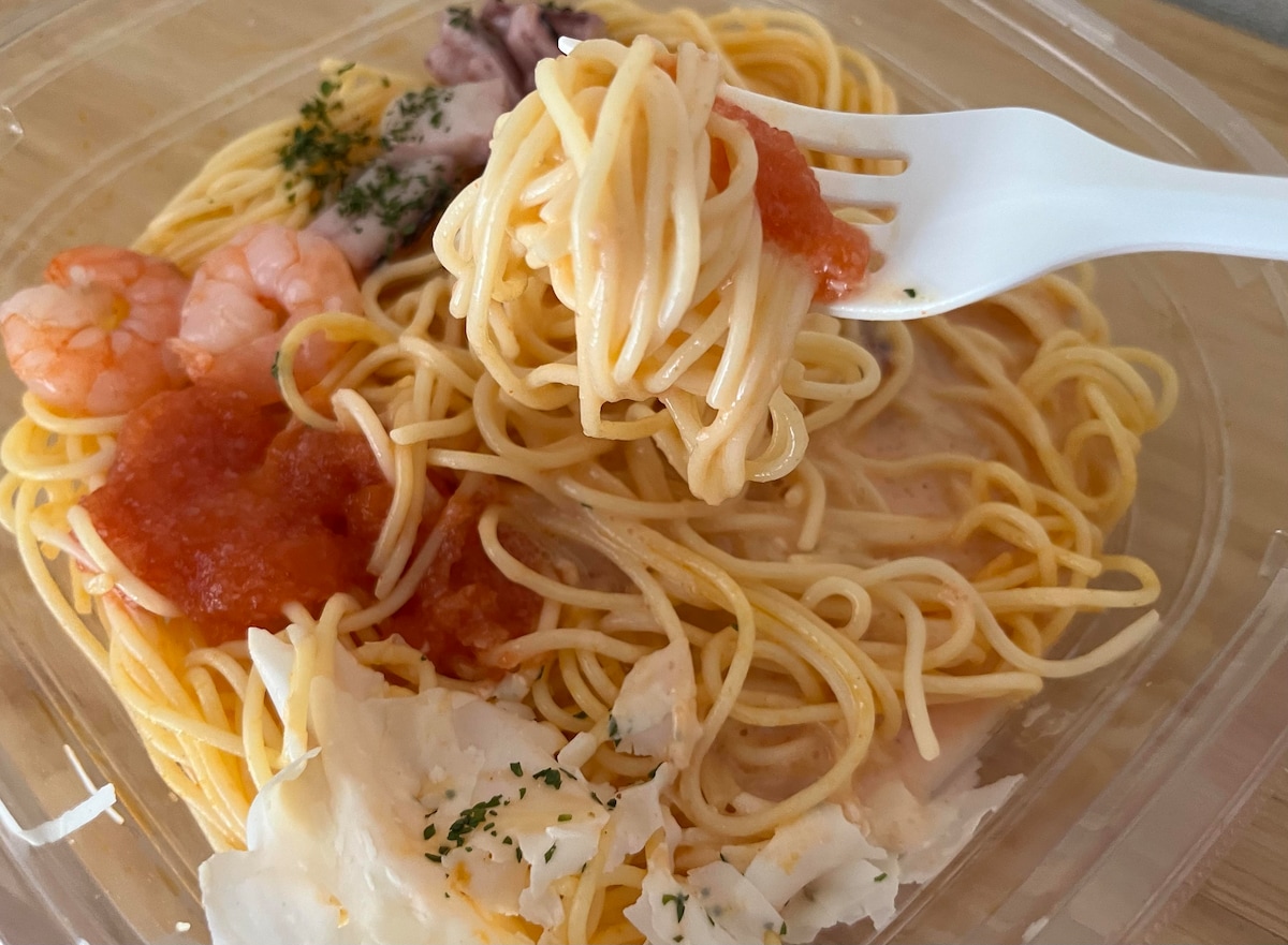 明太子はピリ辛ですが、明太子クリームソースはまろやかなので、ちょうどいいバランス!魚介の旨みをしっかりと感じられるイカと海老の食感がアクセントとなり、夏にぴったりの爽やかな味わいです。食べると口の中で広がる海の香りとスパイシーな明太子の風味が絶妙で美味しくいただけました。