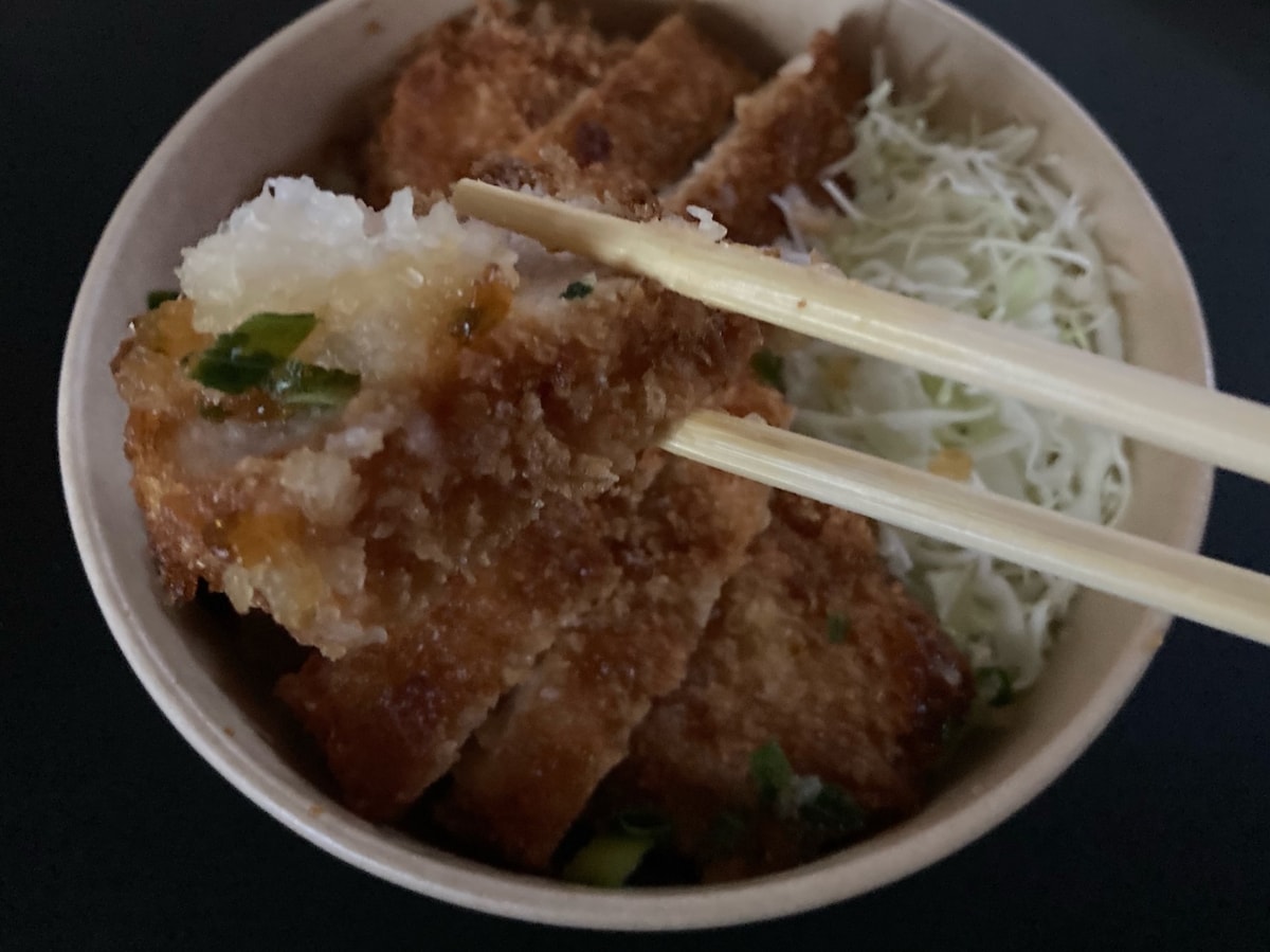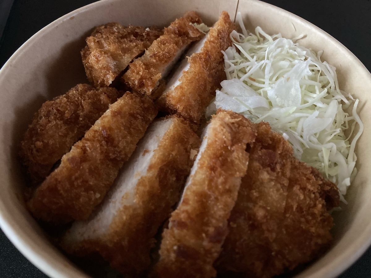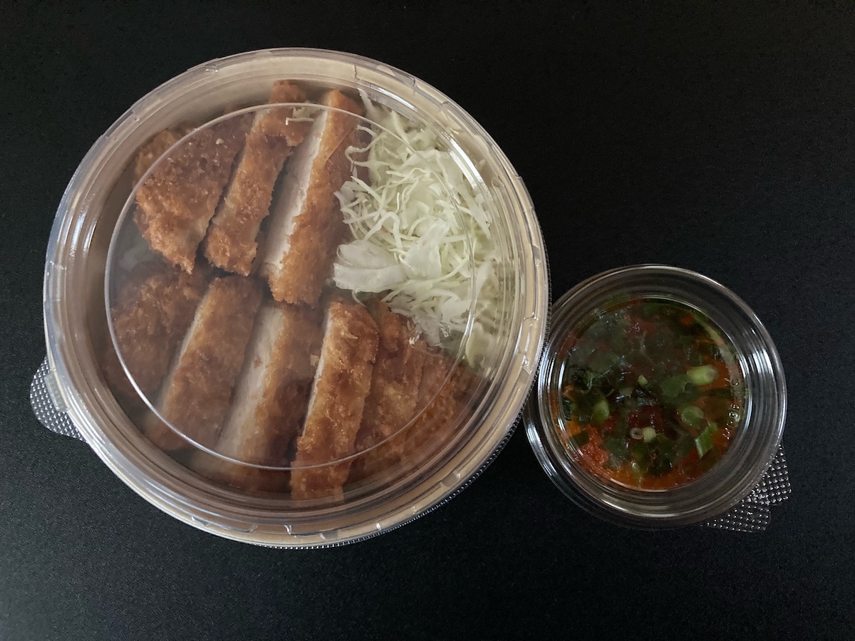 ロースカツと千切りキャベツはご飯のうえにダイレクトに乗っており、ポン酢ジュレが入った大根おろしは別の容器に入っています。