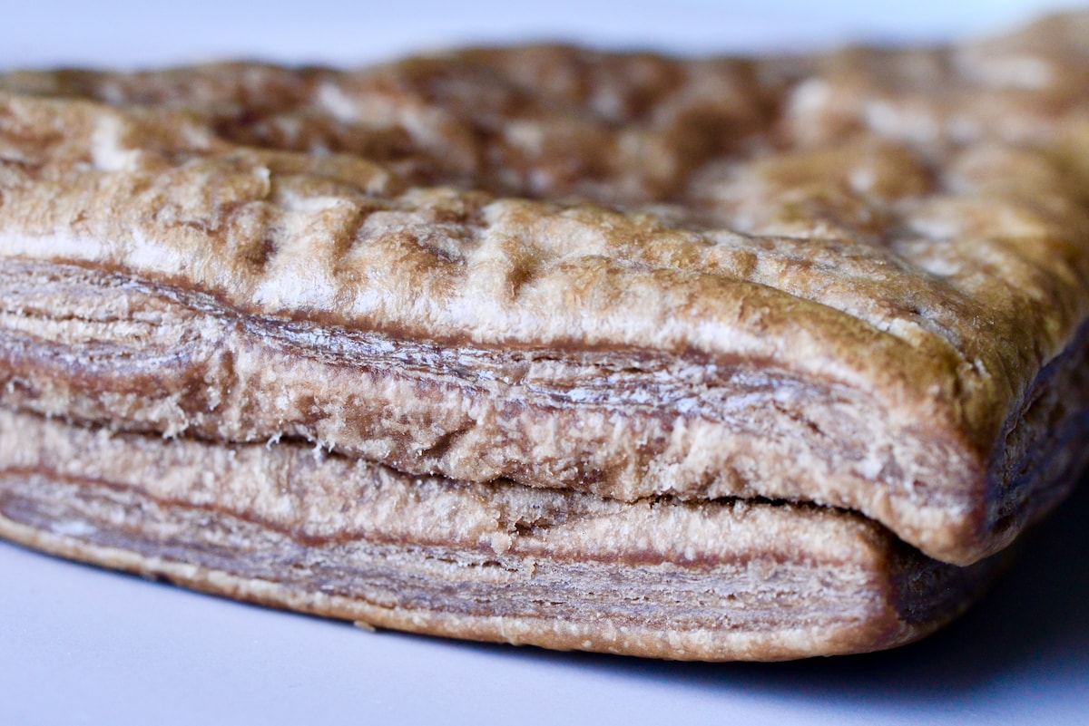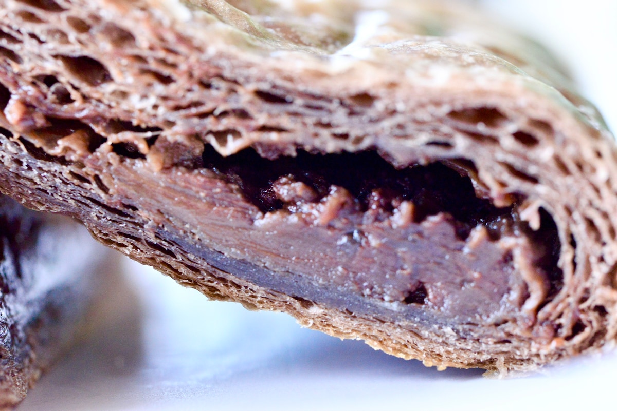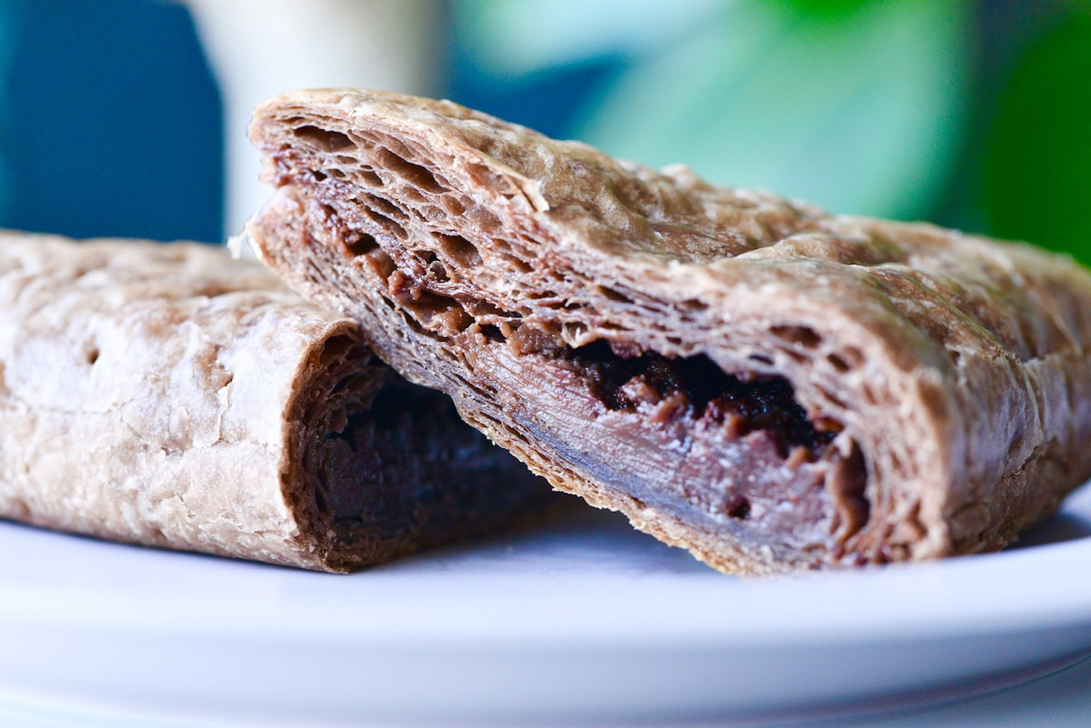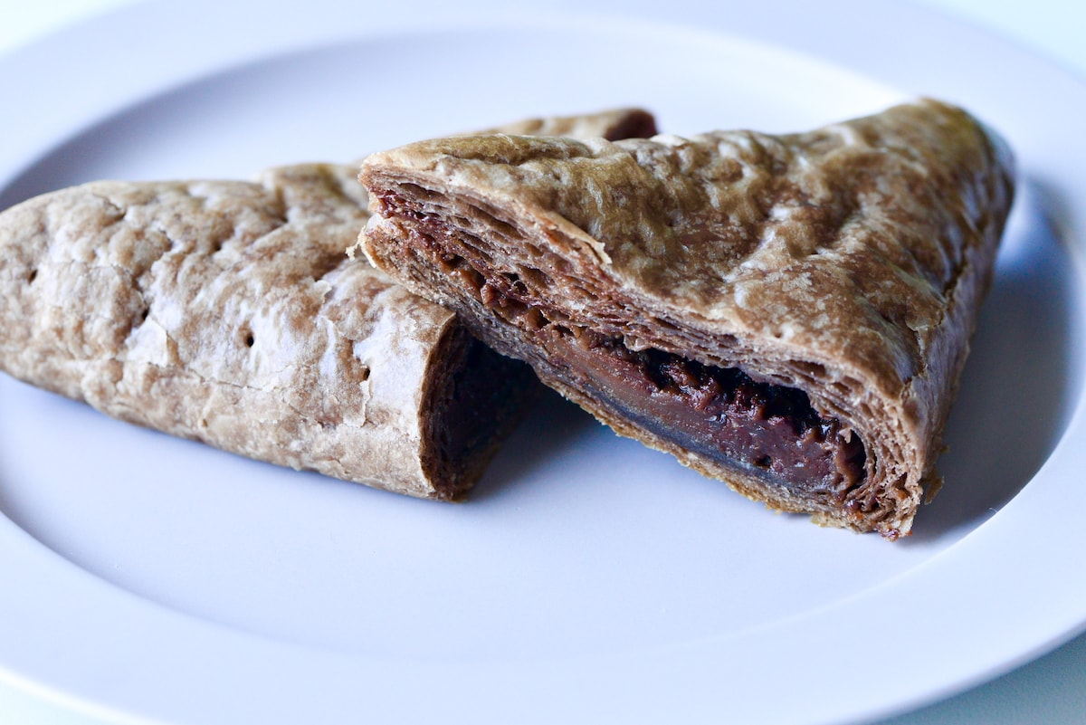 次に、トースターで2分焼いて食べてみました。外側の生地は常温時に比べて少しサクッとした食感に。チョコレートの甘味も常温時より強く、ねっとりとした食感はやや柔らかくなり、おいしかったです。サクサクとまではいきませんが、サクッと食感のパイが好きな方はトースターで温めてから食べるのがおすすめです。
