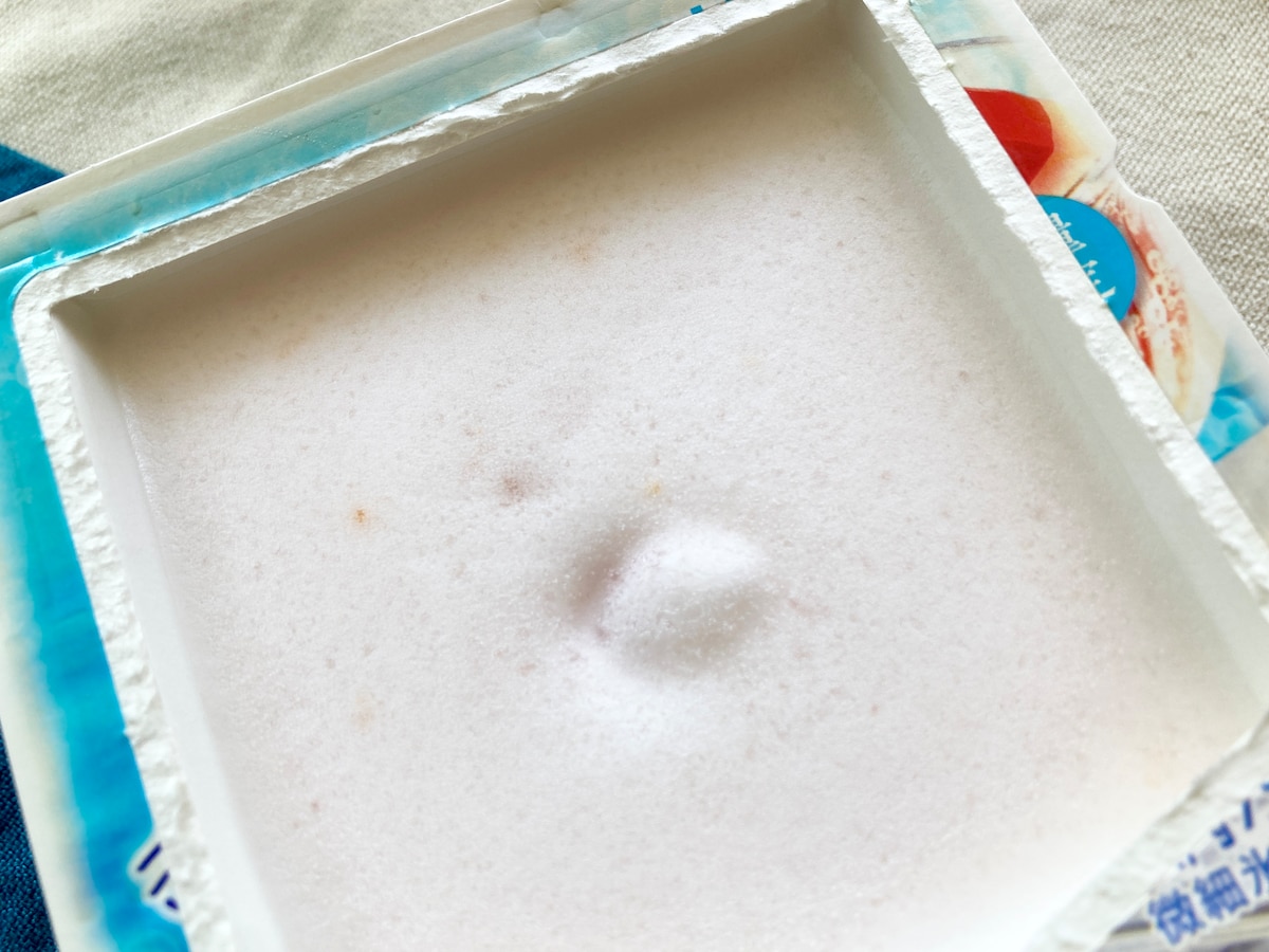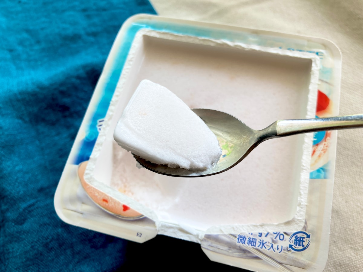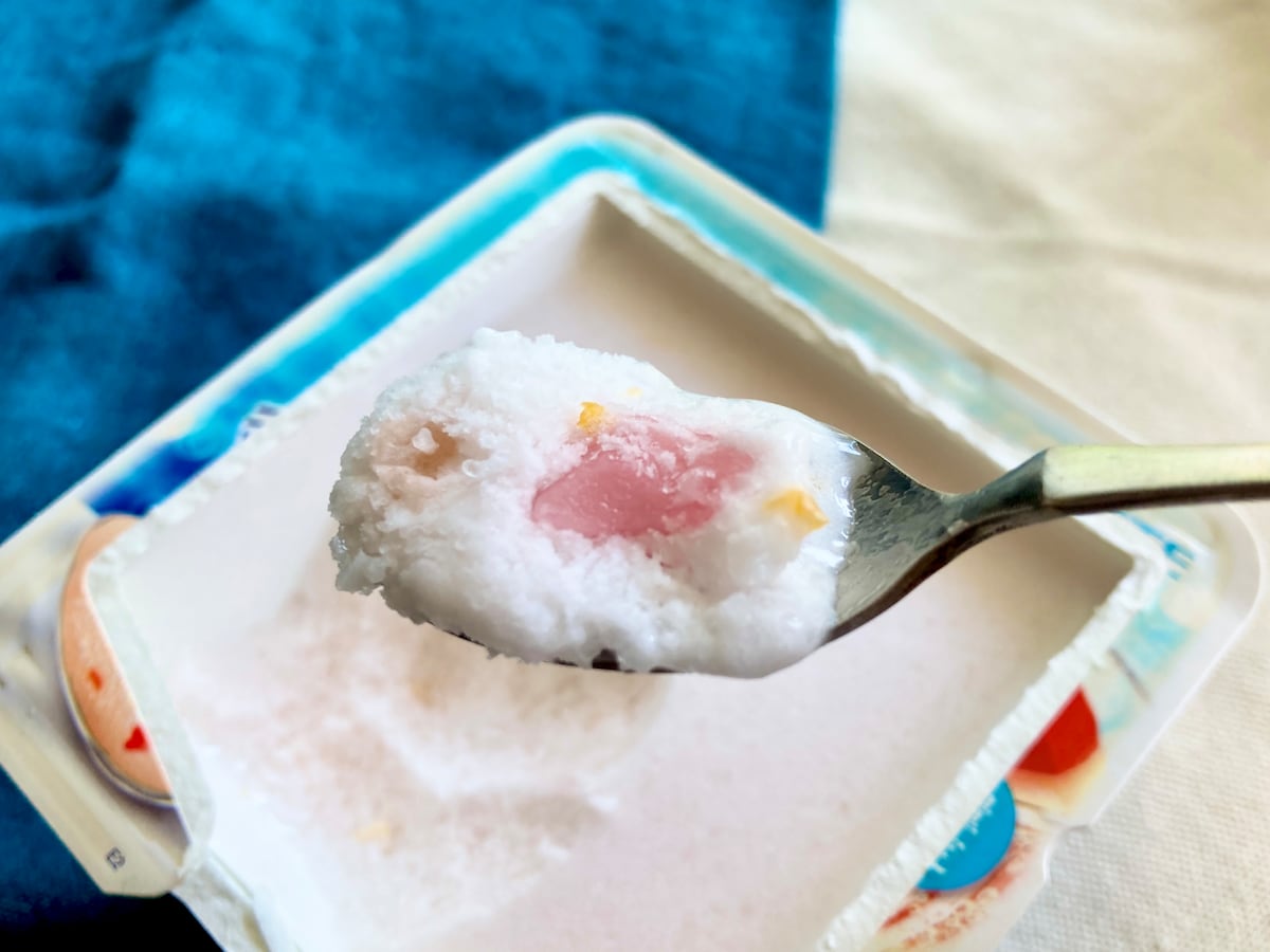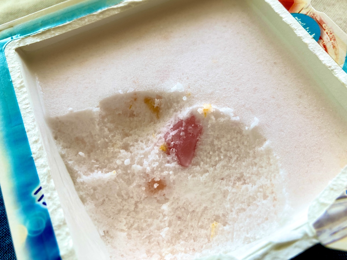 食べてみるとフルーツゼリーでした! ややプルンとしており、シャリっとしたアイスの中で食感の違いがおもしろいです。その他にも桃やみかんの果肉がごろごろと出てきました。