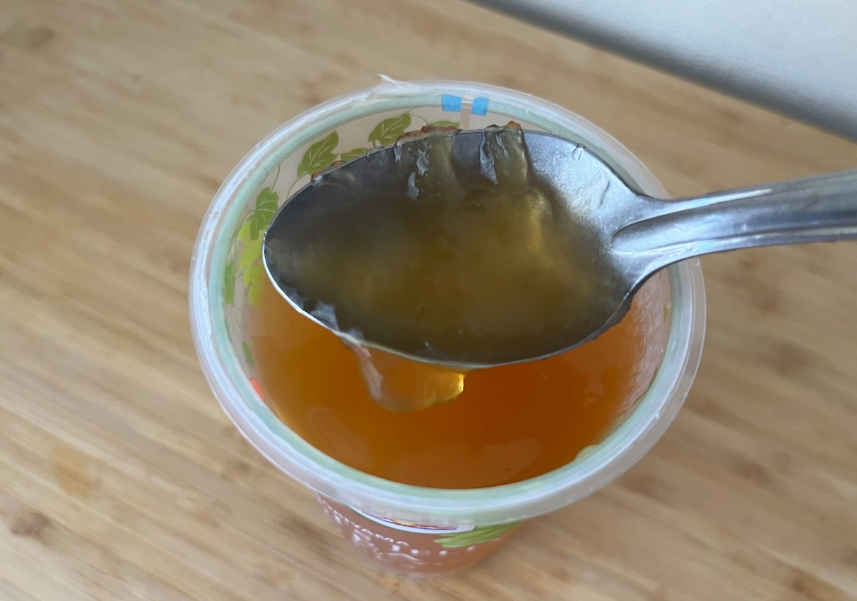 パッと見ではわかりませんが、スプーンで下の方をすくってみると、ゼリーが入っているのがわかります。