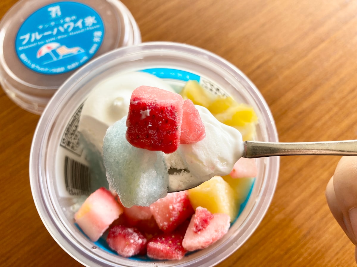 ブルーハワイのかき氷にマンゴーソースを入れ、さらにアイスやマンゴーといちごの果肉をトッピングした、見た目も豪華な氷菓カップアイス! 早速実食レポです♡