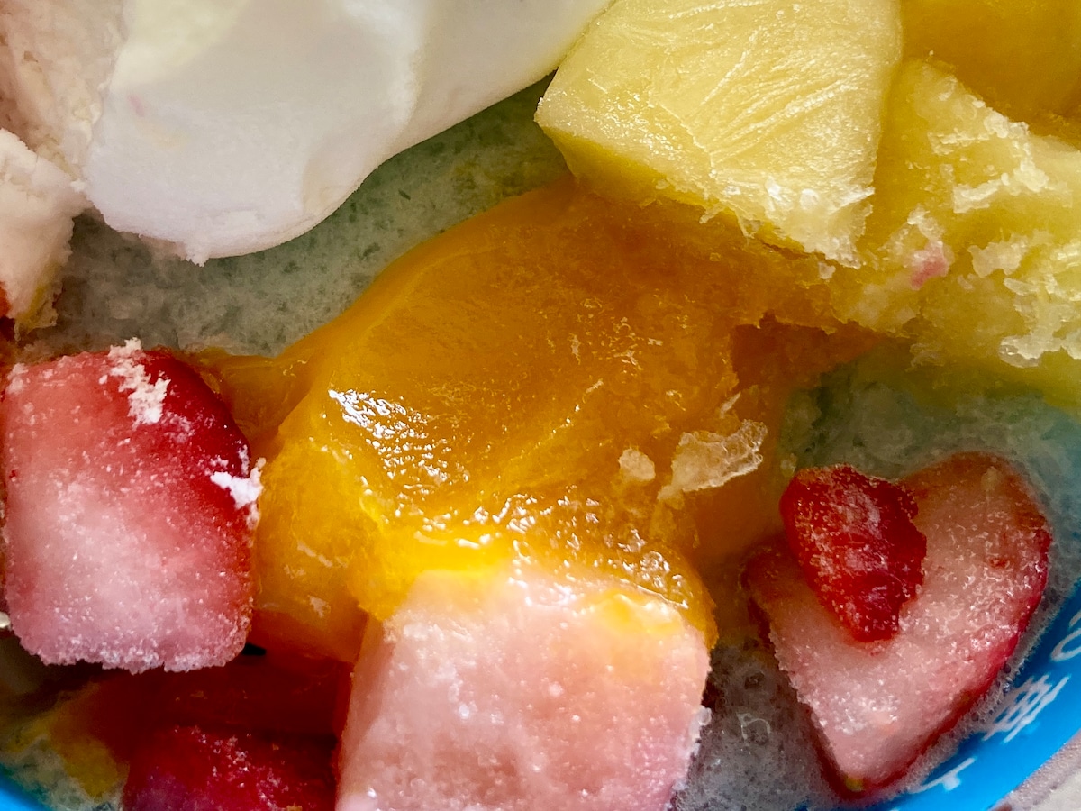 下のブルーハワイ氷が全く見えないくらいたっぷり乗せられたトッピングに、もはやどちらが主役なのかわからなくなってきました。ここはもう、フルーツ×アイス×ブルーハワイのトリプル主演ということにしておきましょう。