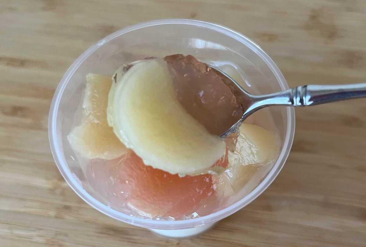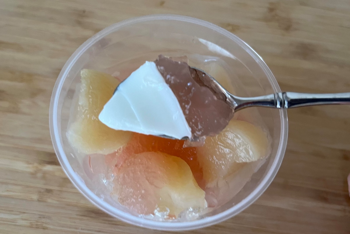 白桃の果肉は甘みと程よい酸味があります。白桃は夏に旬を迎えるフルーツで、その爽やかな甘さと香りが特徴です。白桃ゼリーは甘めで、パンナコッタはミルキー!パンナコッタは口どけもよく、まろやかでとてもおいしい!爽やかな白桃の果肉や甘めの白桃ゼリーとの相性も抜群!個人的には、特にパンナコッタがおいしく感じました。