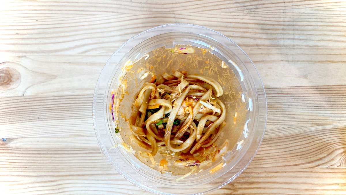 まずは蓋をしたままシェイクします!ソースをまんべんなく麺に絡めるためにも、しっかり振りましょう。