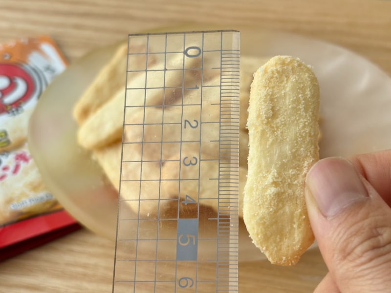 1枚のサイズを定規で測ってみると、長さは5.5cmほどです。小さめのサイズ感は、手軽に食べたいときはもちろん、小さいお子さんのおやつにしたいときにもうれしいですよね。