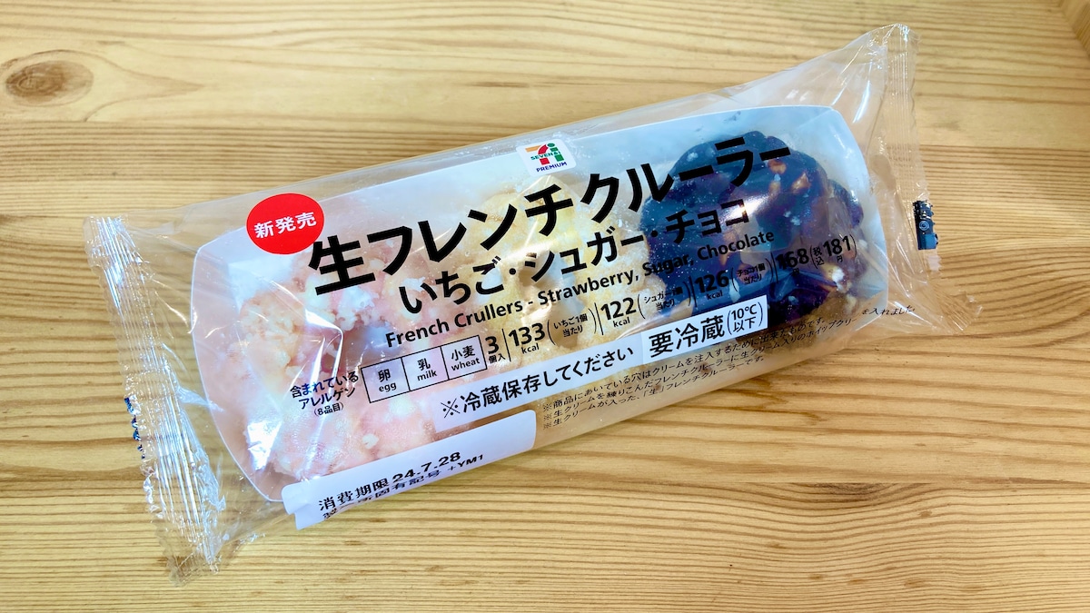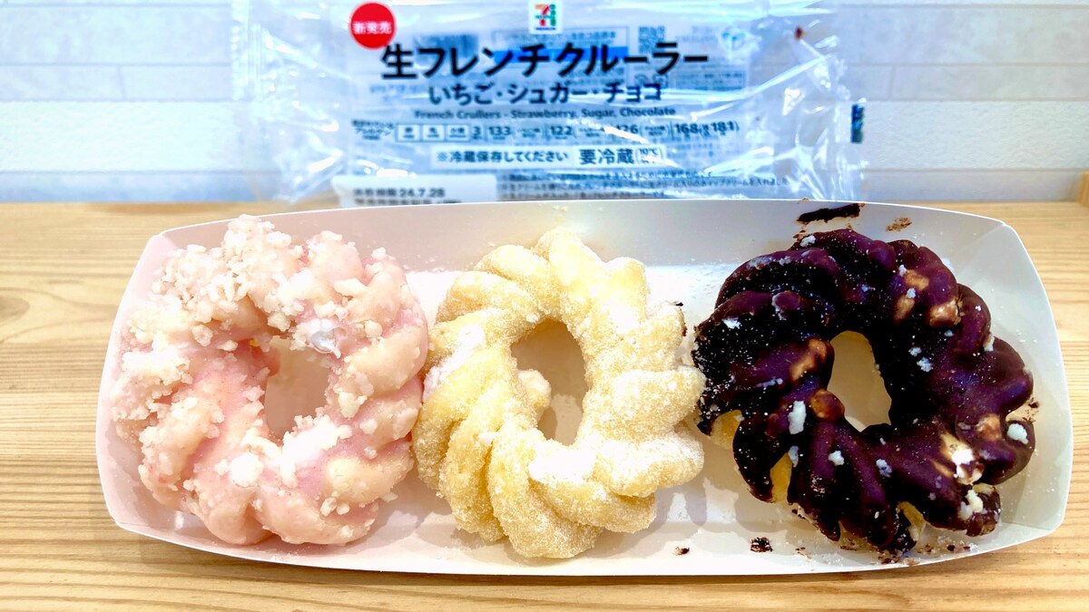 セブン-イレブンは2024年07月25日(木)「7プレミアム 生フレンチクルーラー3個入」を新発売しました。価格は税込み181円です。いちごチョコ・シュガー・チョコの3種類が楽しめる小さくて可愛い商品です♪