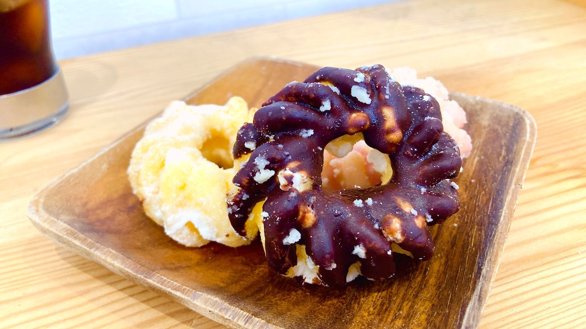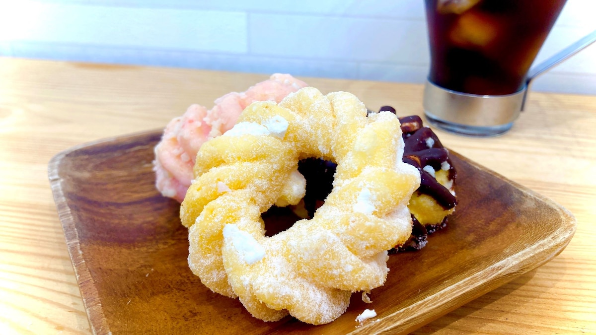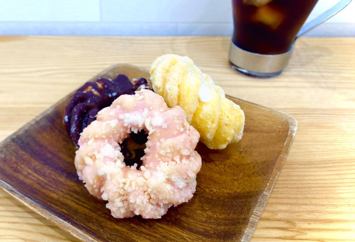 3種類の生フレンチクルーラーちゃんがお行儀よく整列しています。この子たち……とっても小さくて可愛らしいんです♪(小ささが写真で伝わらずですが……)
